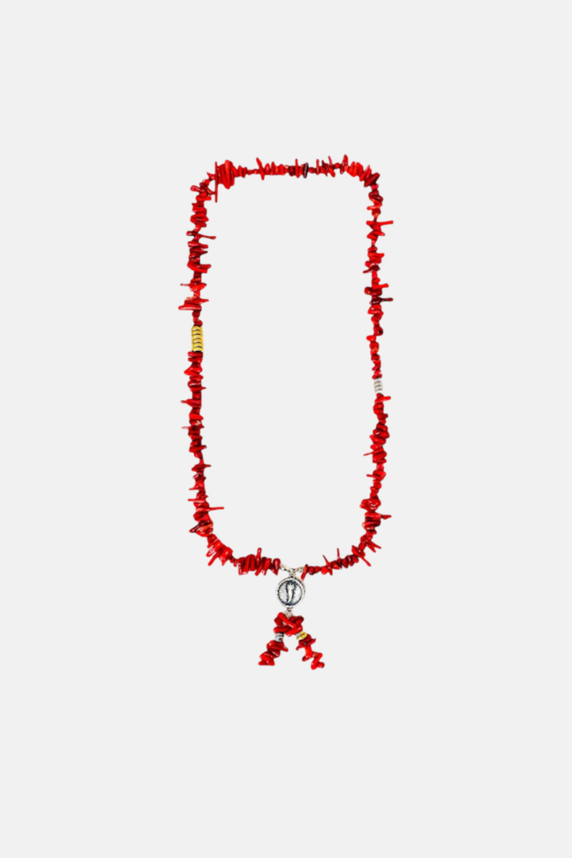 Nasce così la nostra A’ CIORTA: collana in stile Mala Tibetano realizzata a mano con pietre asimmetriche di Pasta di Corallo rosso fuoco intervallate da intermezzi in Acciaio 316L argento e placcati in Oro 18k, con targhetta del cornicello in Zamak e treccia di pietre al posto della classica nappina.