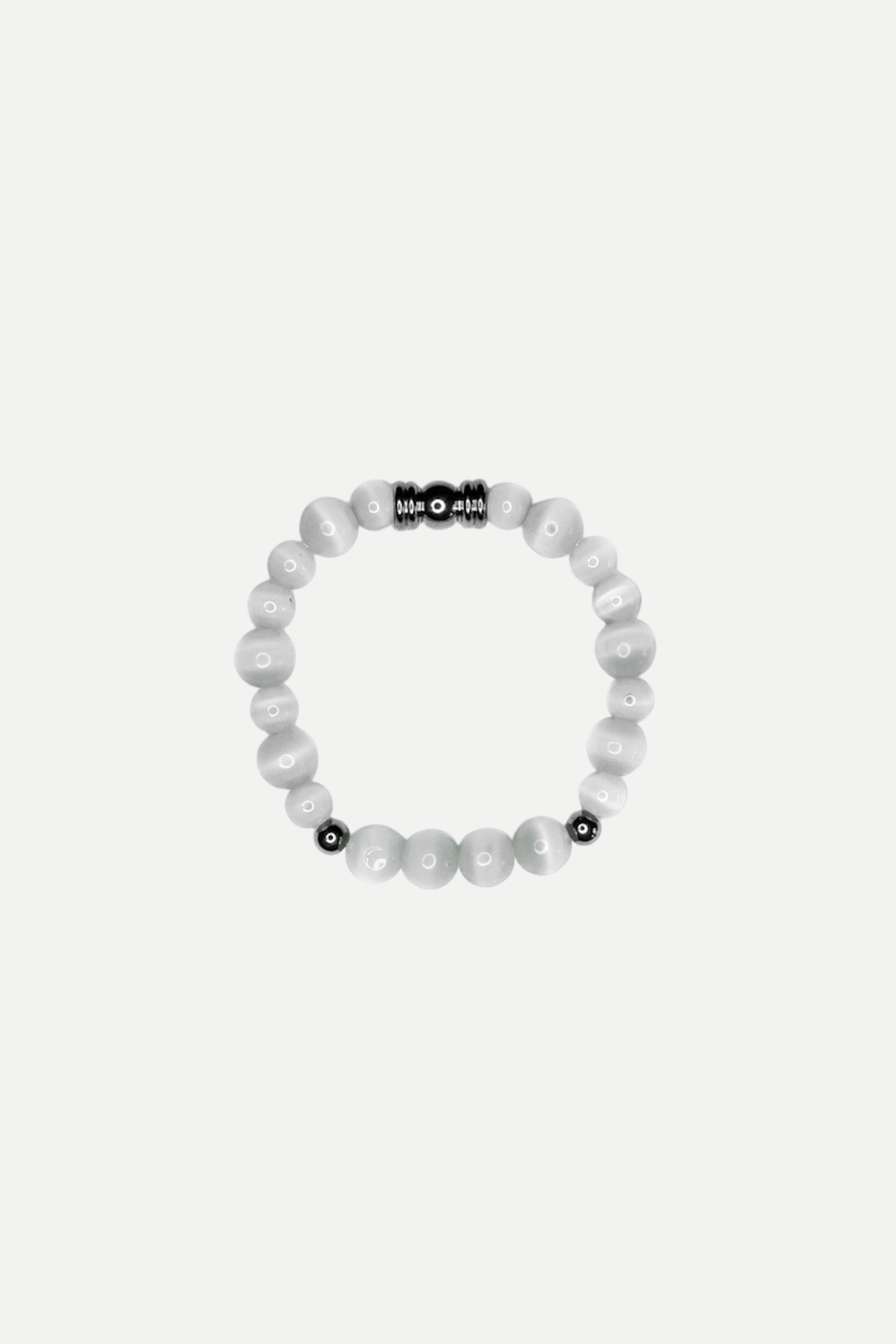 Dall’omonima collana, la sua versione bracciale AMAHORO, realizzato a mano con pietre di Occhio di Gatto Bianca e intermezzi in Acciaio 316L.