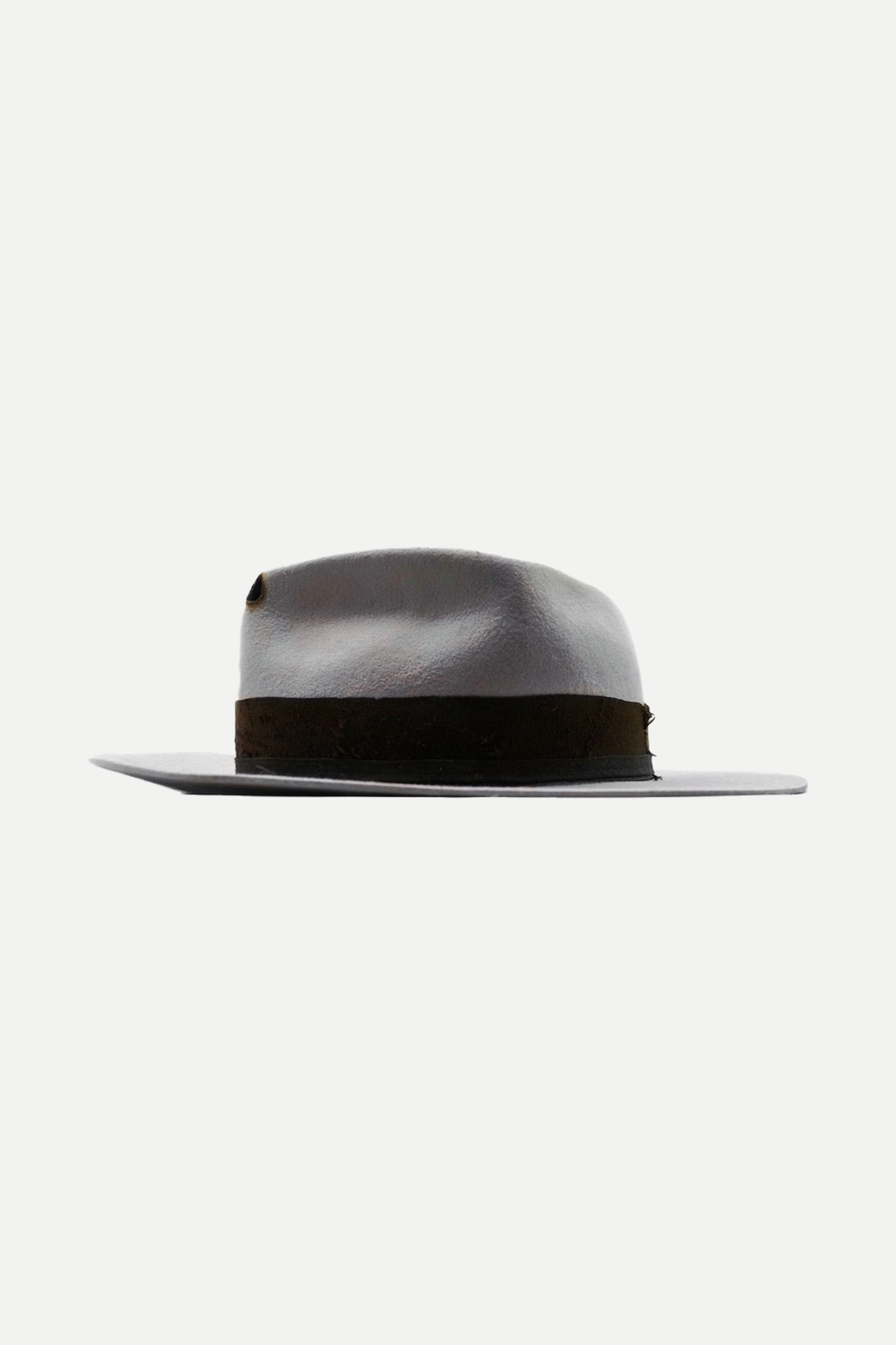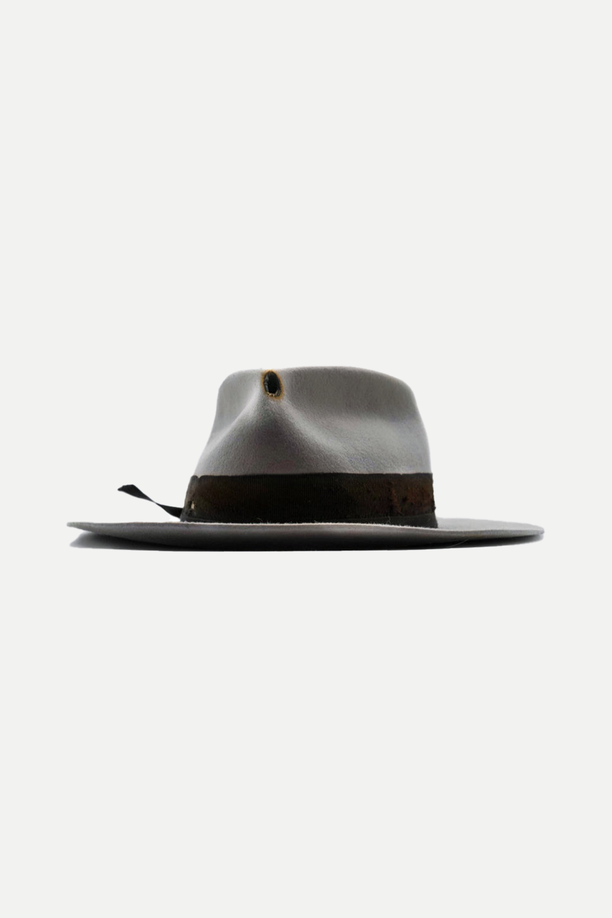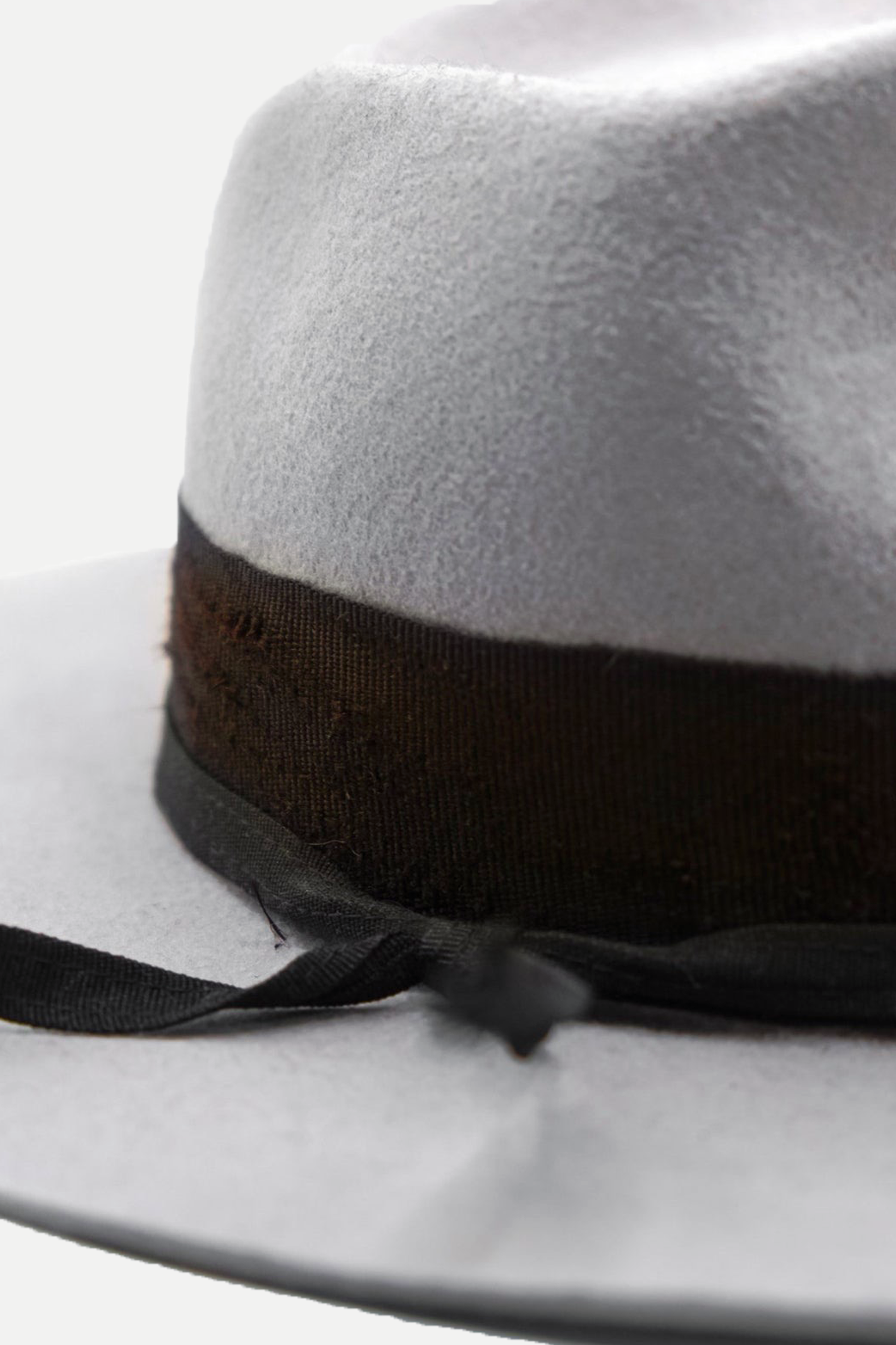 Un cappello che grida personalità. Il BOHEMIAN è ispirato allo stile grunge, realizzato a mano in feltro Premium di coniglio grigio chiaro con buco di proiettile sulla punta, fascia in grograin testa di moro consumata e stilizzata e sottofascia in grograin nero da 10mm con fiocco sciolt, tesa da 7,5cm e corona a forma leggermente romboidale. PEZZO UNICO.