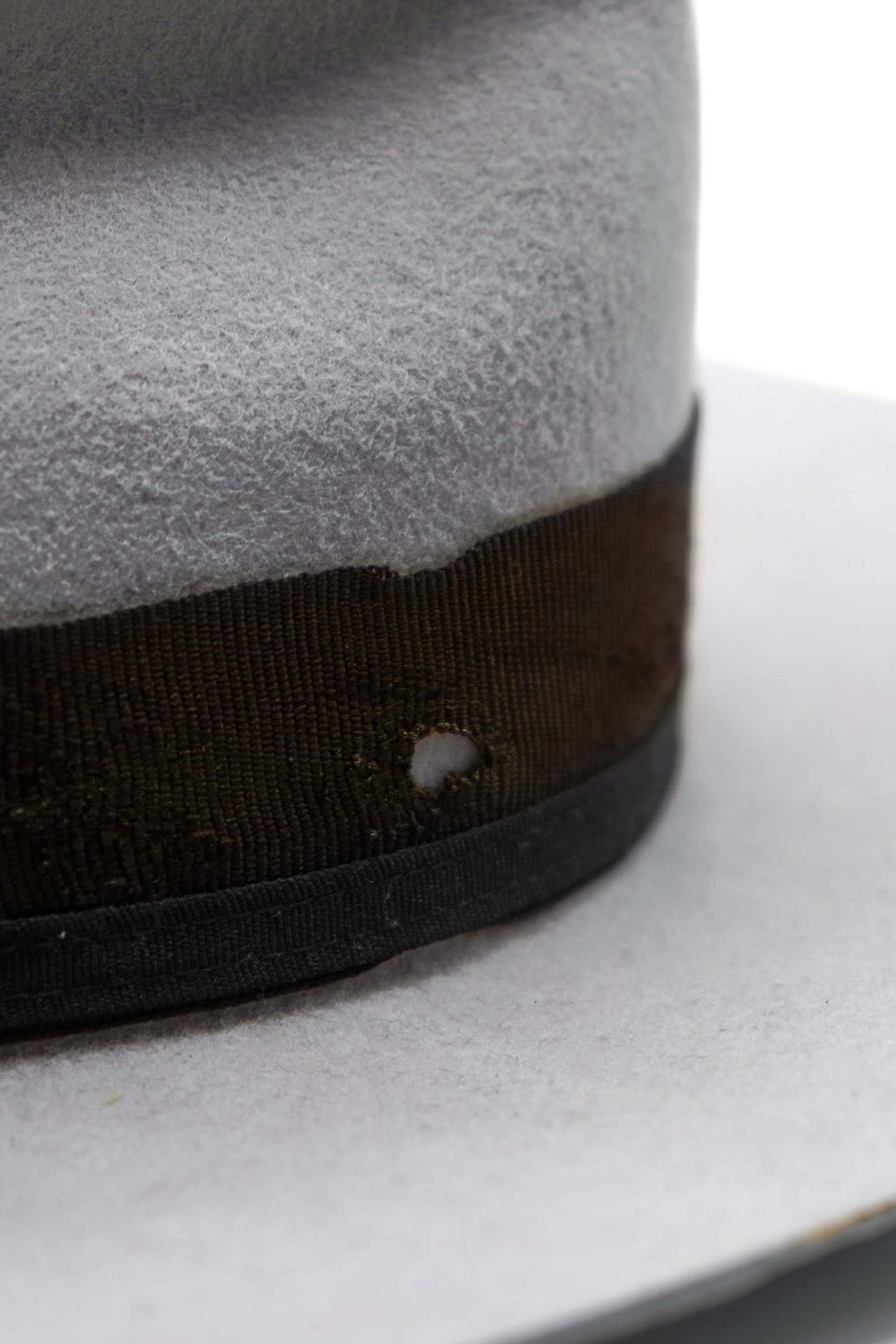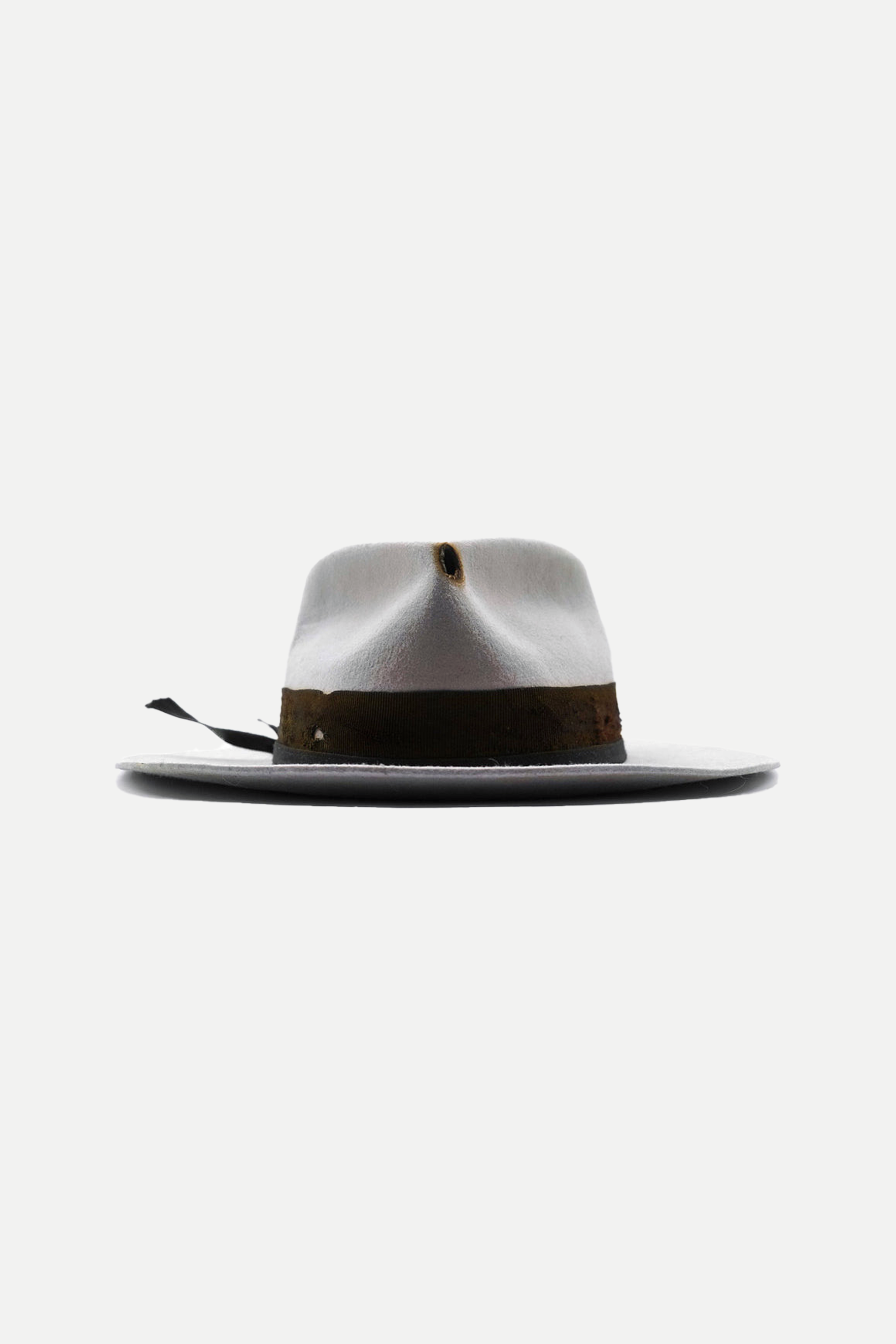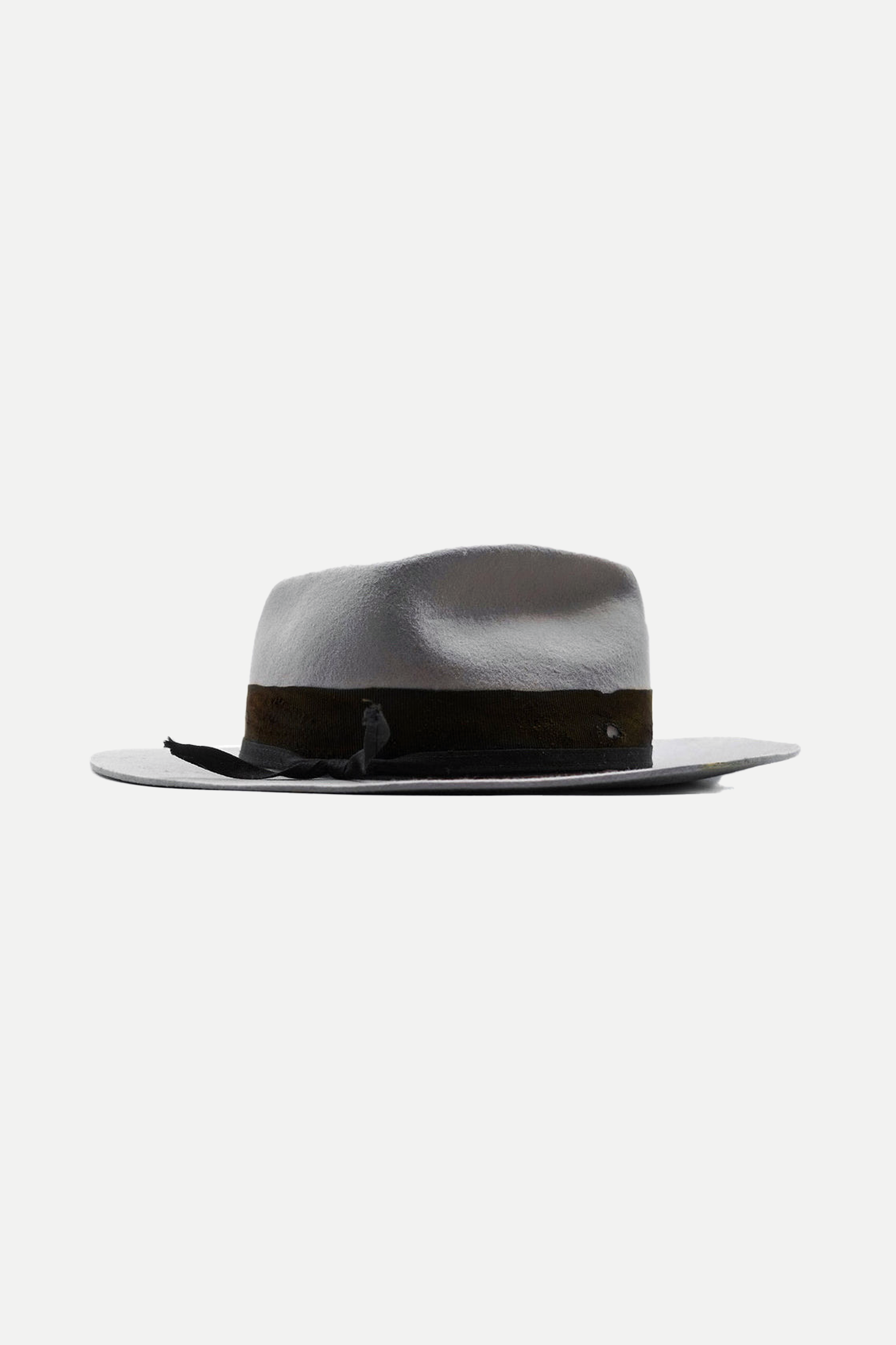 Un cappello che grida personalità. Il BOHEMIAN è ispirato allo stile grunge, realizzato a mano in feltro Premium di coniglio grigio chiaro con buco di proiettile sulla punta, fascia in grograin testa di moro consumata e stilizzata e sottofascia in grograin nero da 10mm con fiocco sciolt, tesa da 7,5cm e corona a forma leggermente romboidale. PEZZO UNICO.