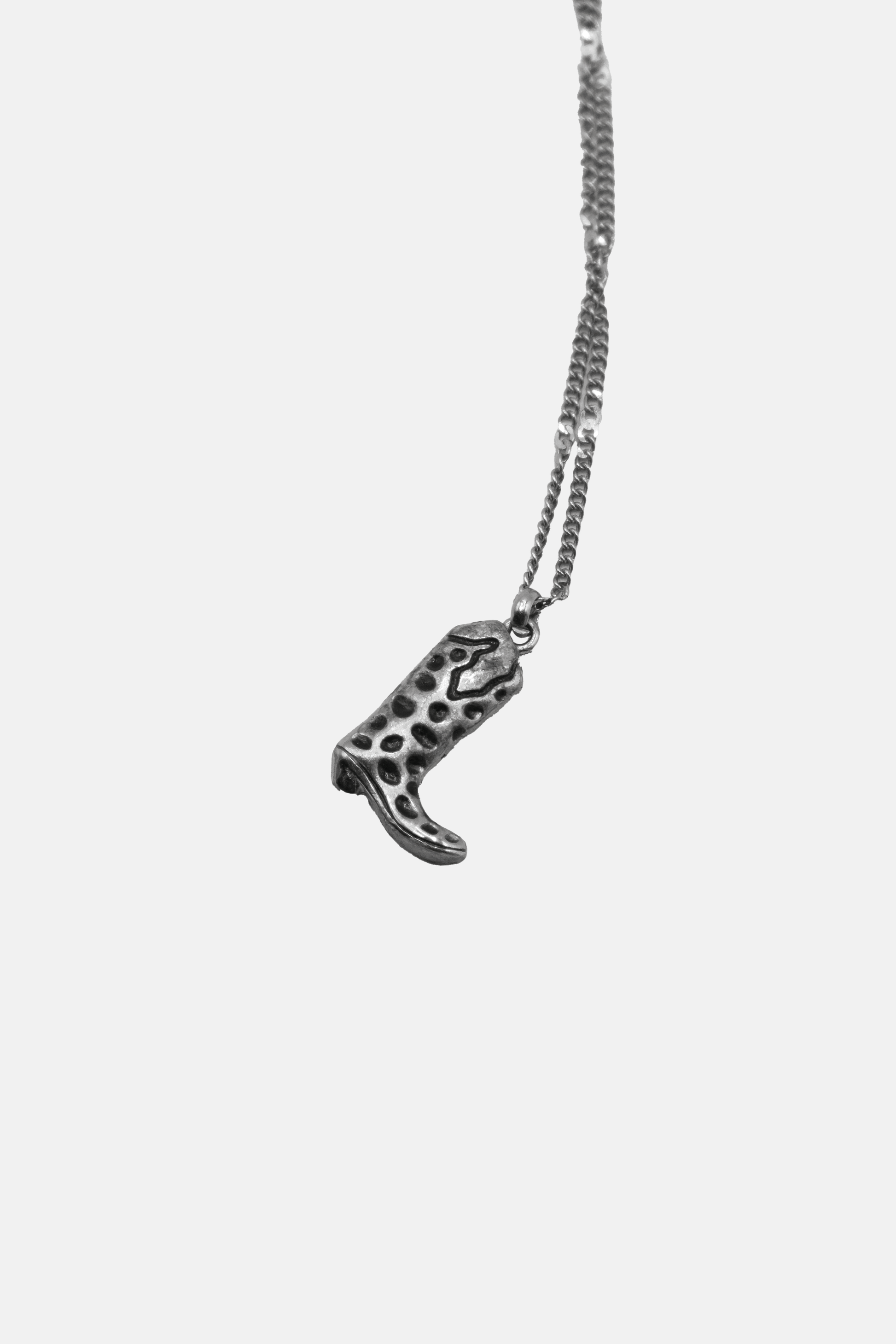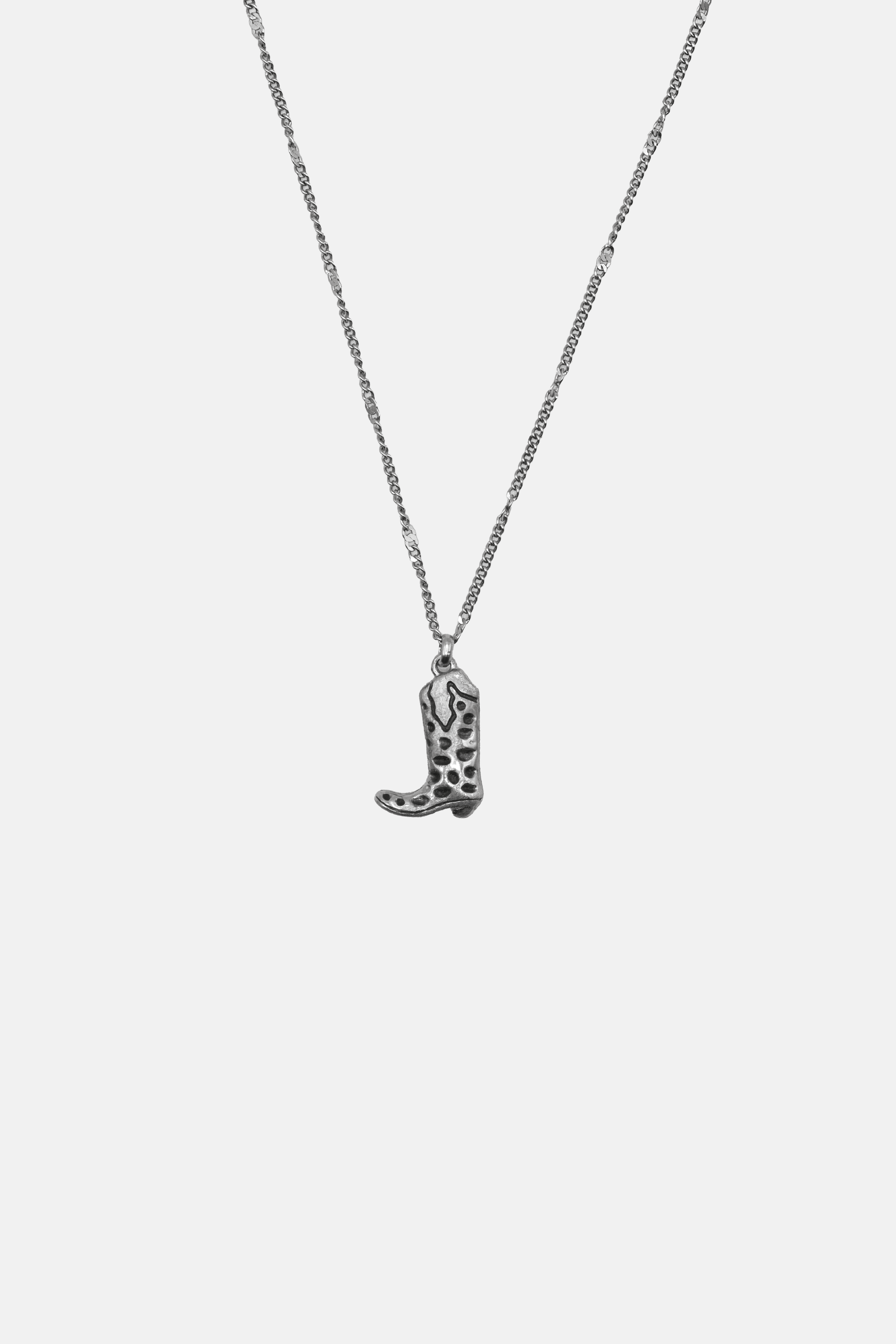 Direttamente dal Selvaggio West, la 'Bootcut' è una collana realizzata interamente a mano in Acciaio 316L con pendente stilizzato a forma di stivale e dettagli texturizzati neri.