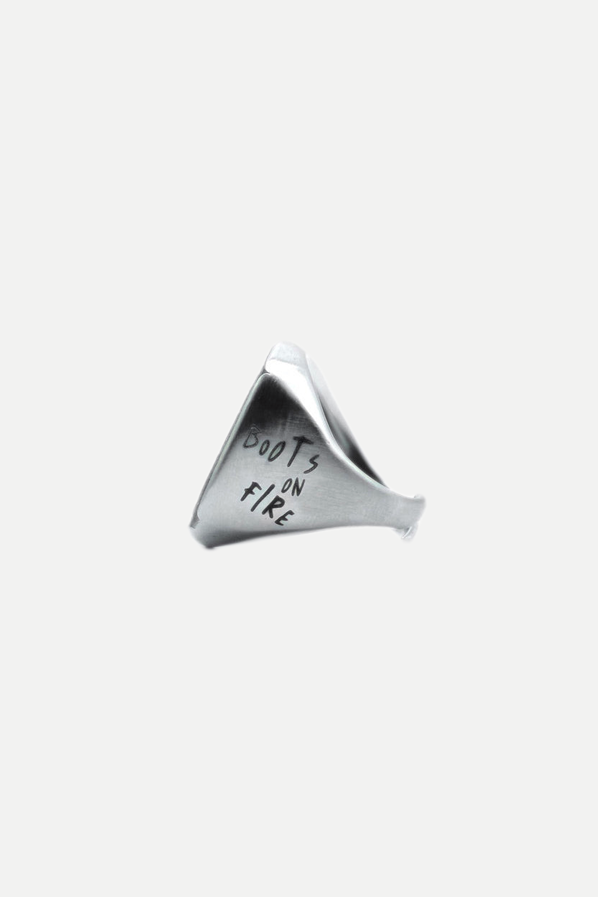 Dalla nuova collezione CULT, l’anello BOOTS ON FIRE é realizzato completamente a mano in Acciaio 316L grezzo con incisione a rilievo della sagoma a 3mm e scritta laterale.