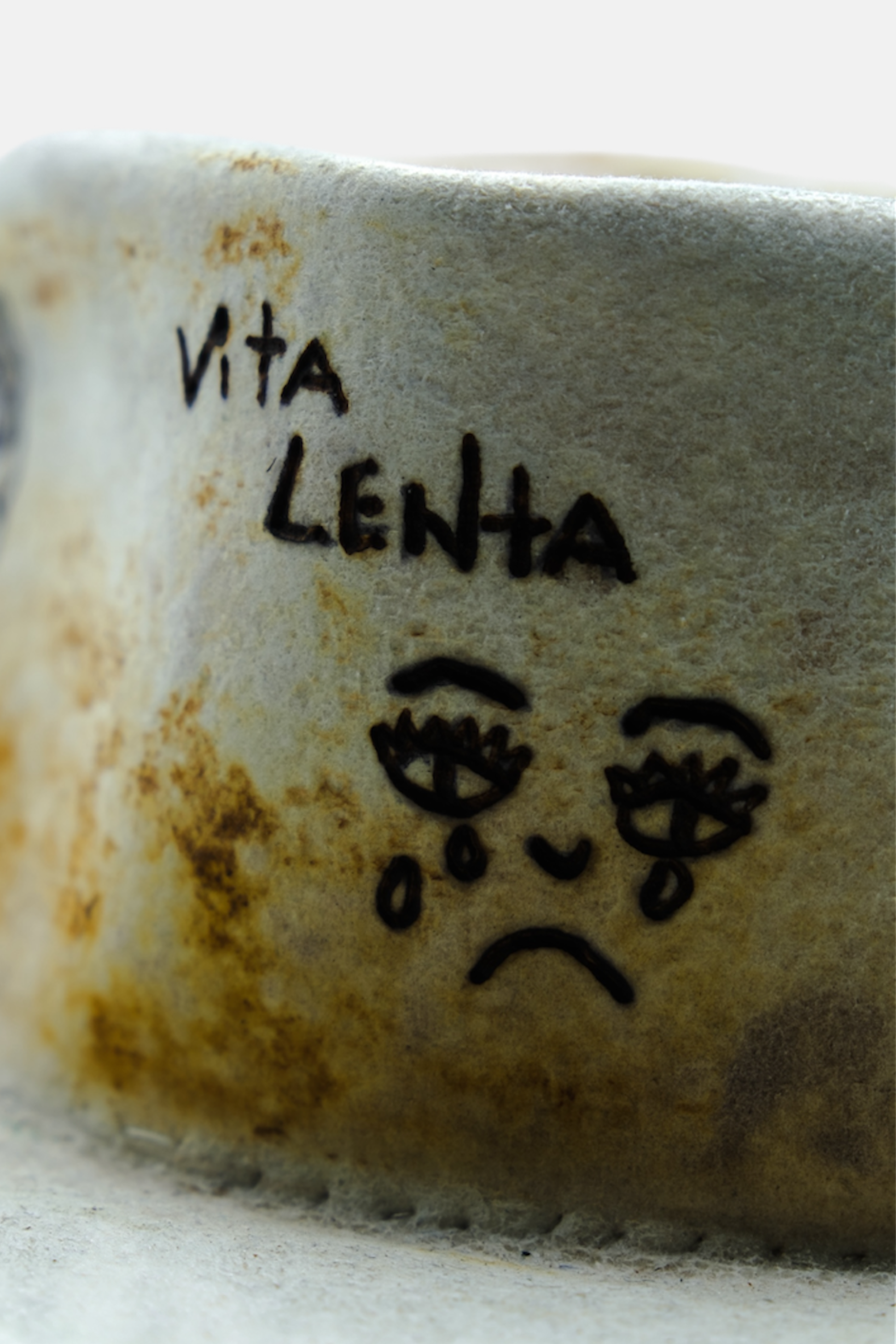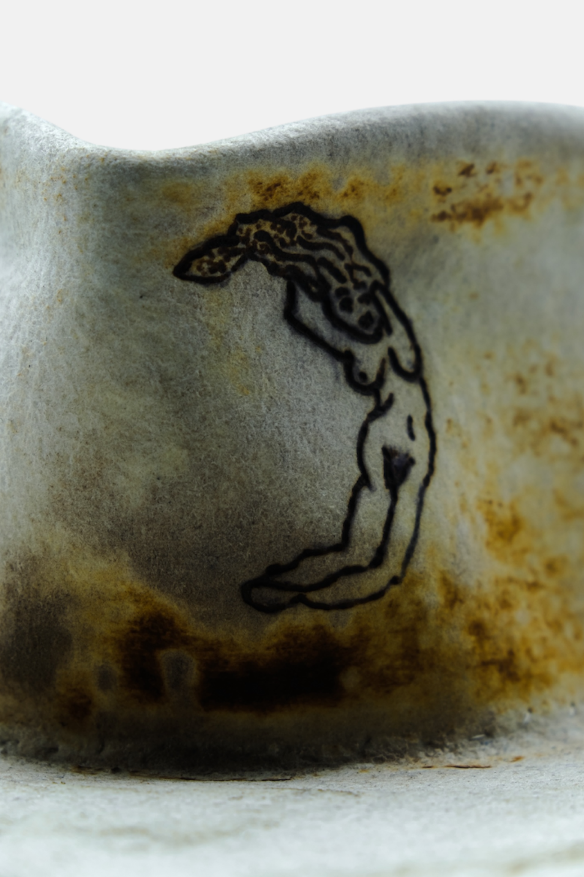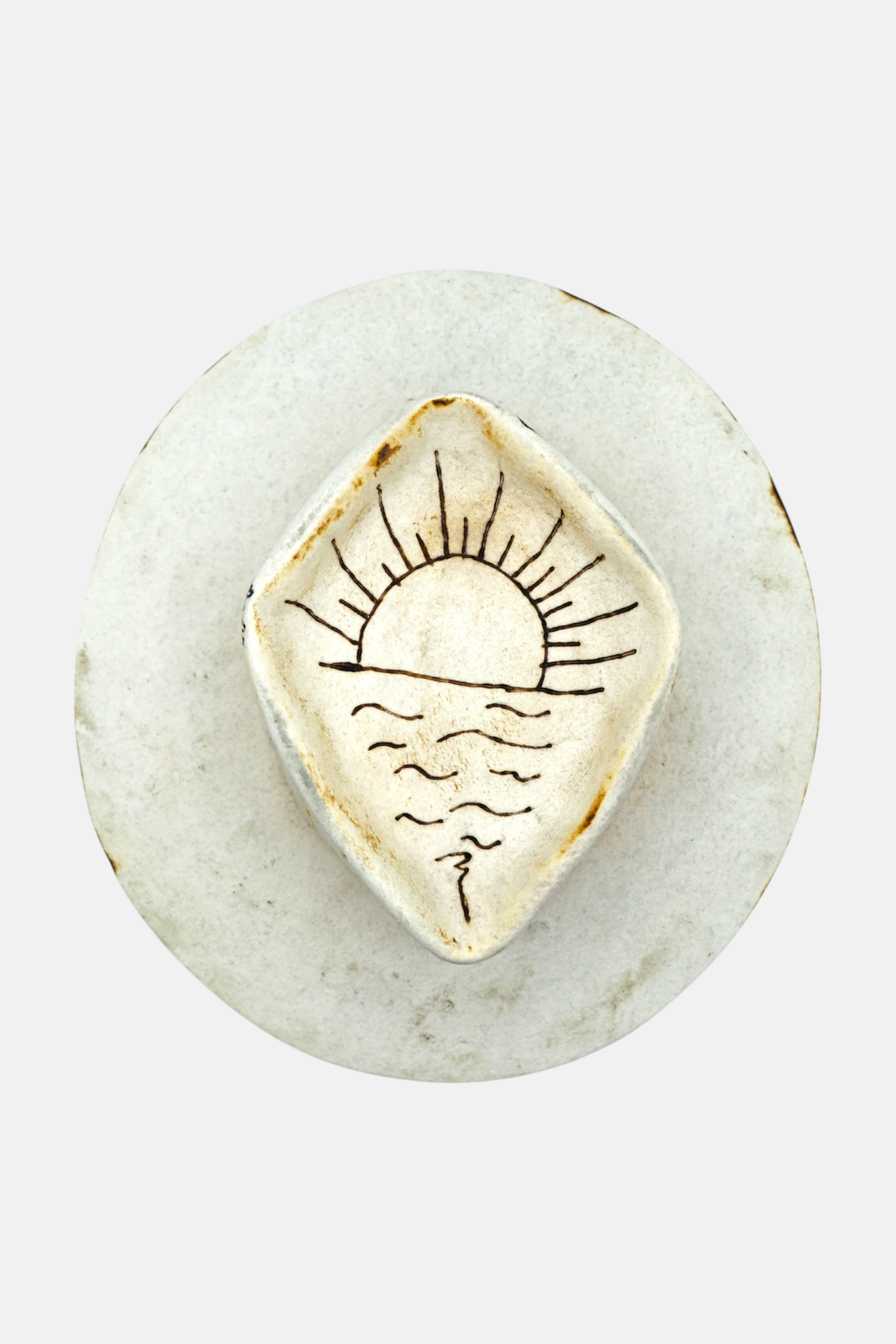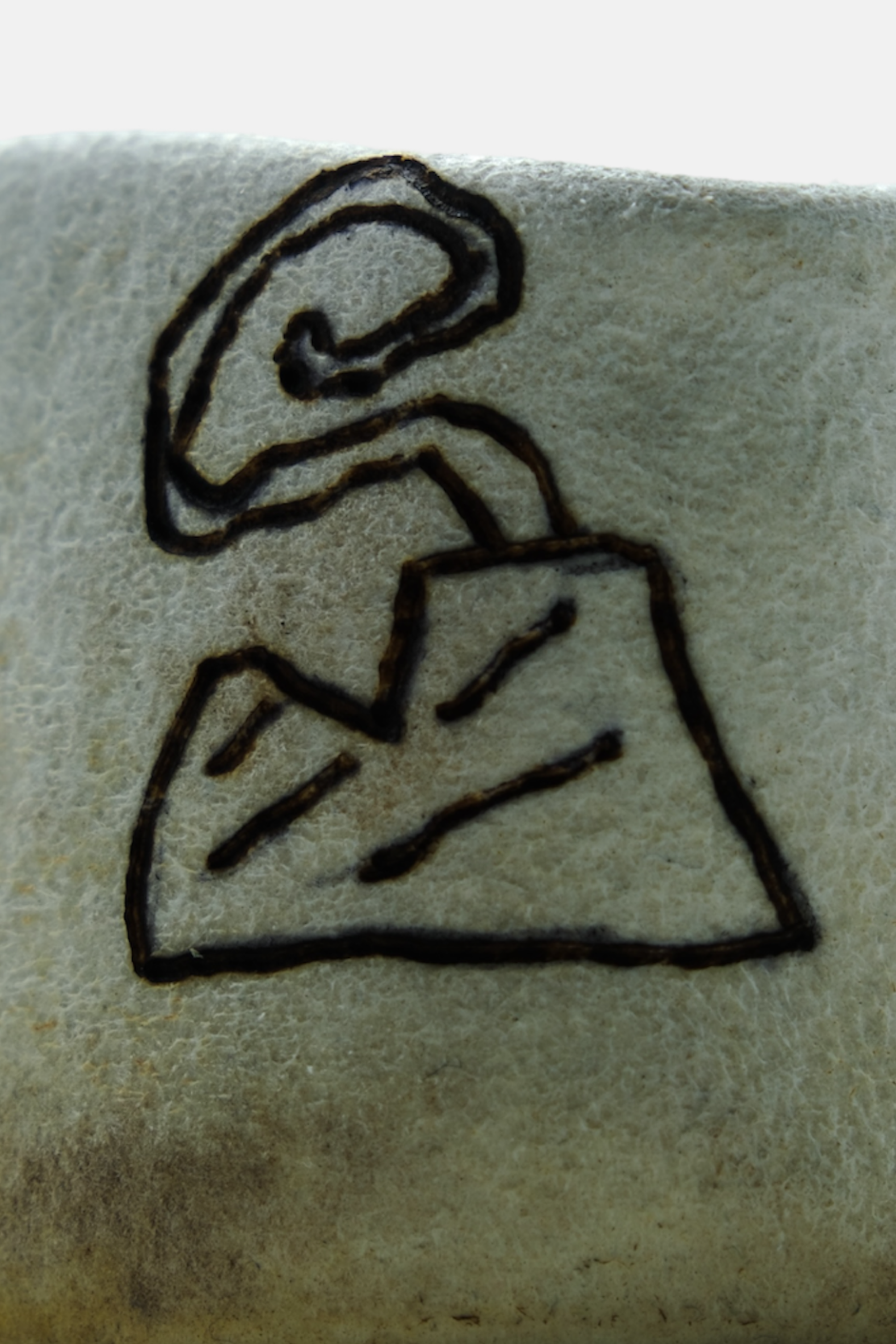 Cappello realizzato a mano in feltro di coniglio beige, tinteggiato con pittura naturale bianca, effetto pelle indurita e arricchito di disegni e frasi incise a mano, forma a rombo, tesa larga da 10 cm.