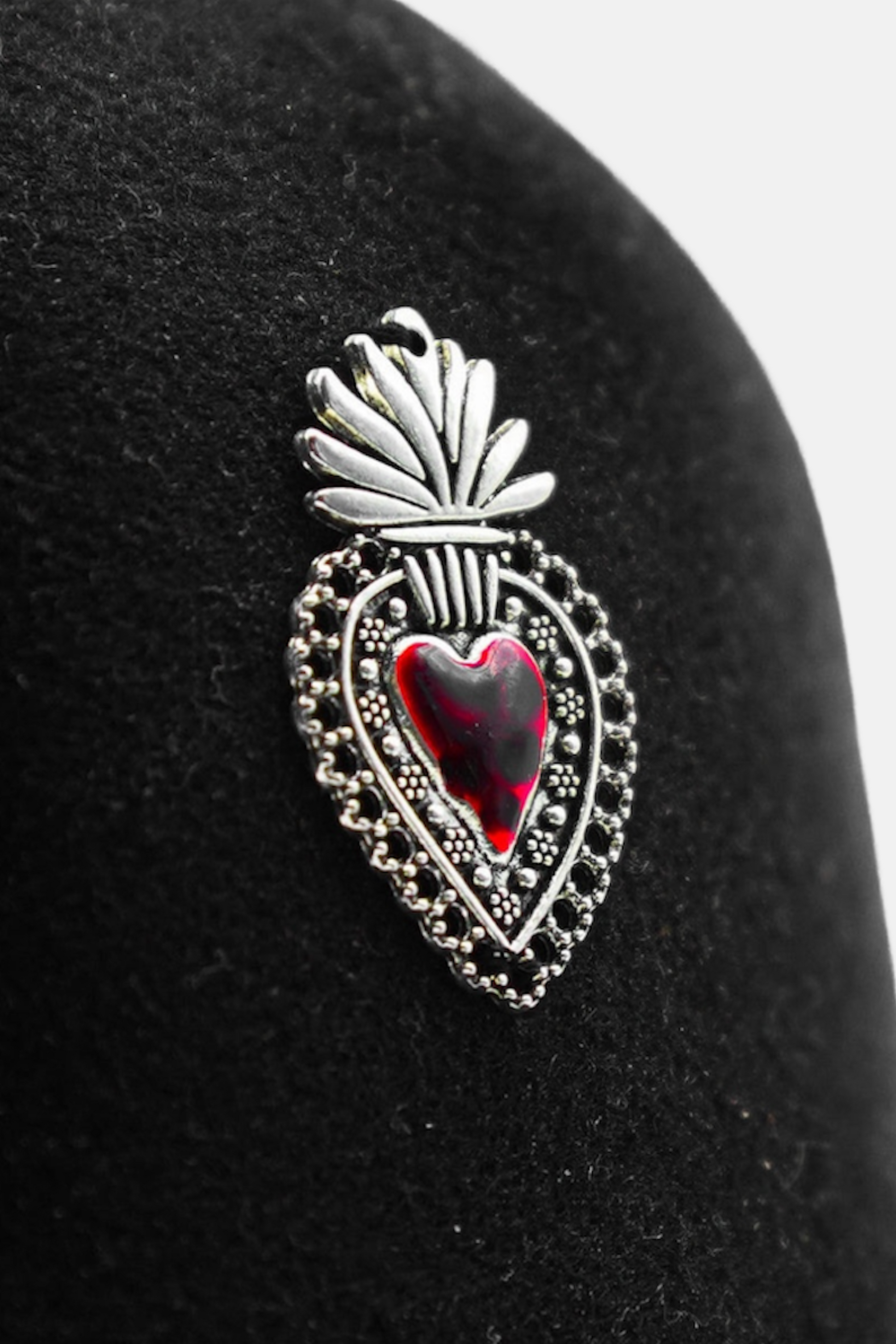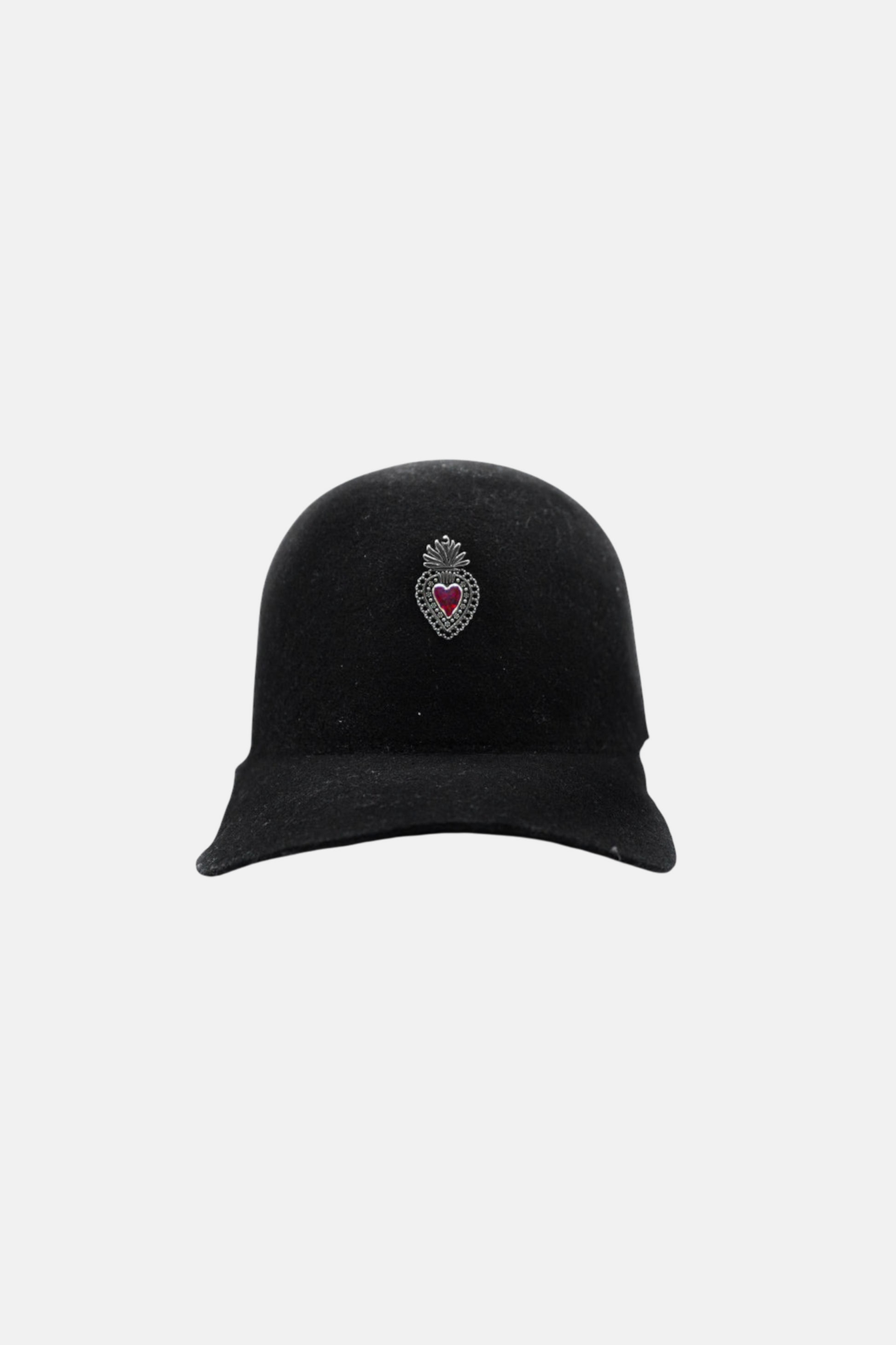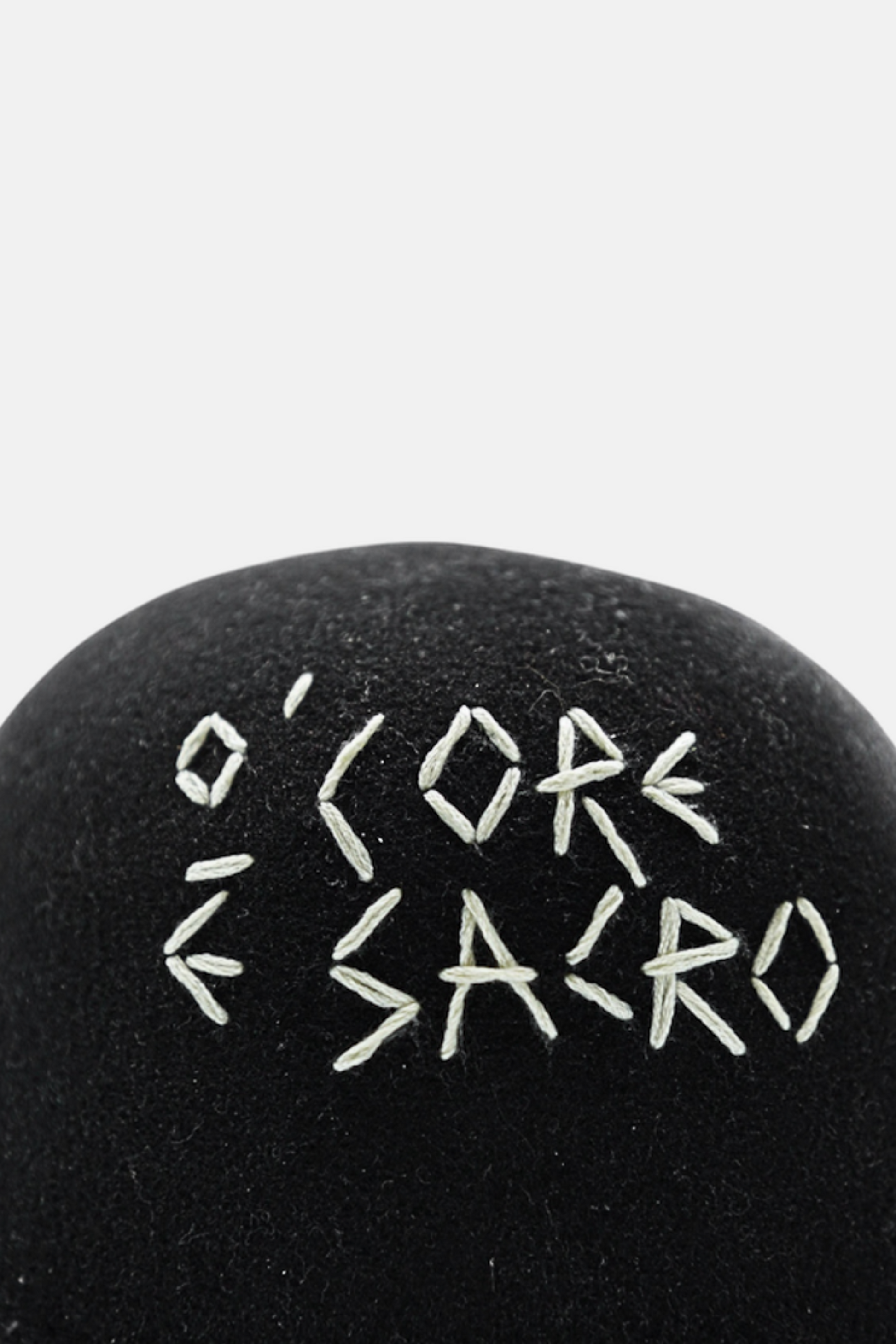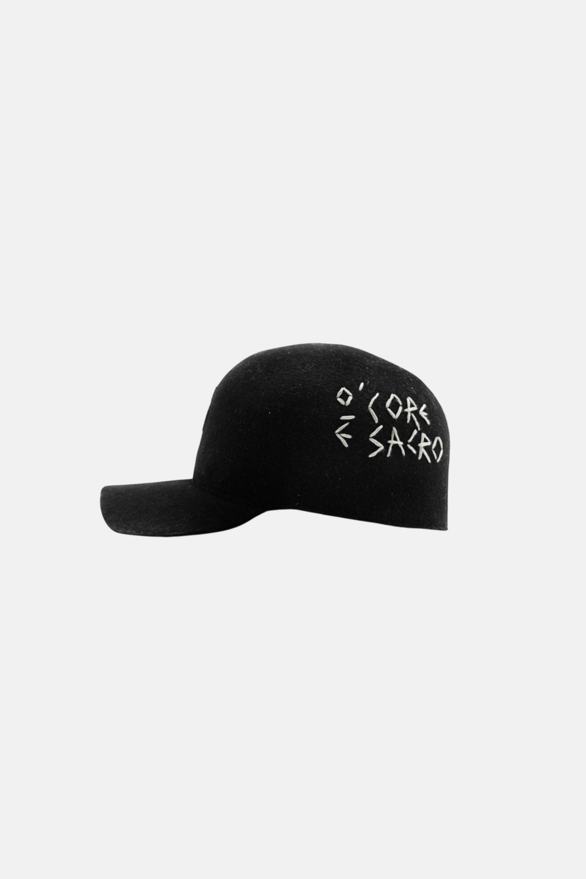 Per la prima volta in Italia, MOKI dá vita ad un berretto modello baseball cap completamente in puro feltro Premium di coniglio. Realizzato interamente a mano, il berretto CORE SACRO NERO ha un pendente in Zama con interni rossi cucito al centro della corona, frase cucita a mano lateralmente e tesa del berretto a 7cm curvata.