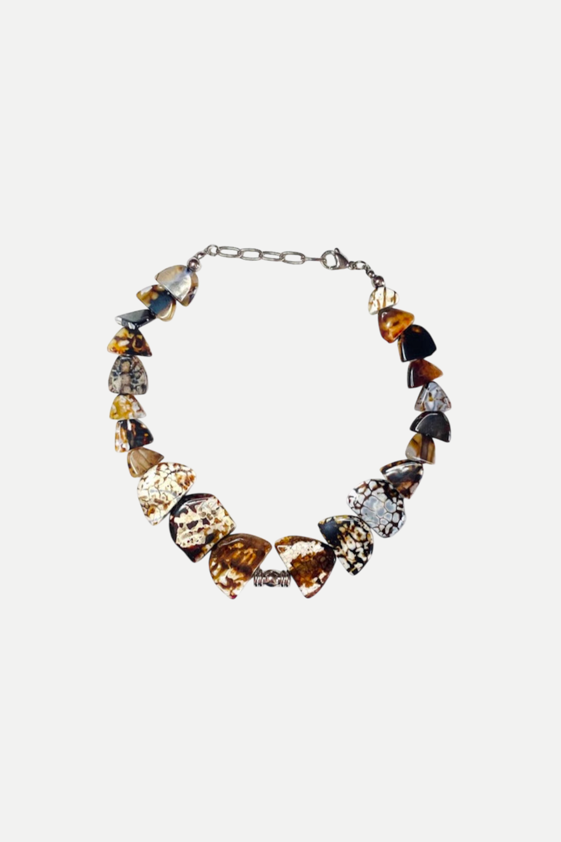 Ispirata alla cultura africana e al fascino selvaggio, la collana FEMME SAUVAGE é un girocollo realizzato a mano in pietre di Agata Marrone e Bianca striata a taglio irregolare.