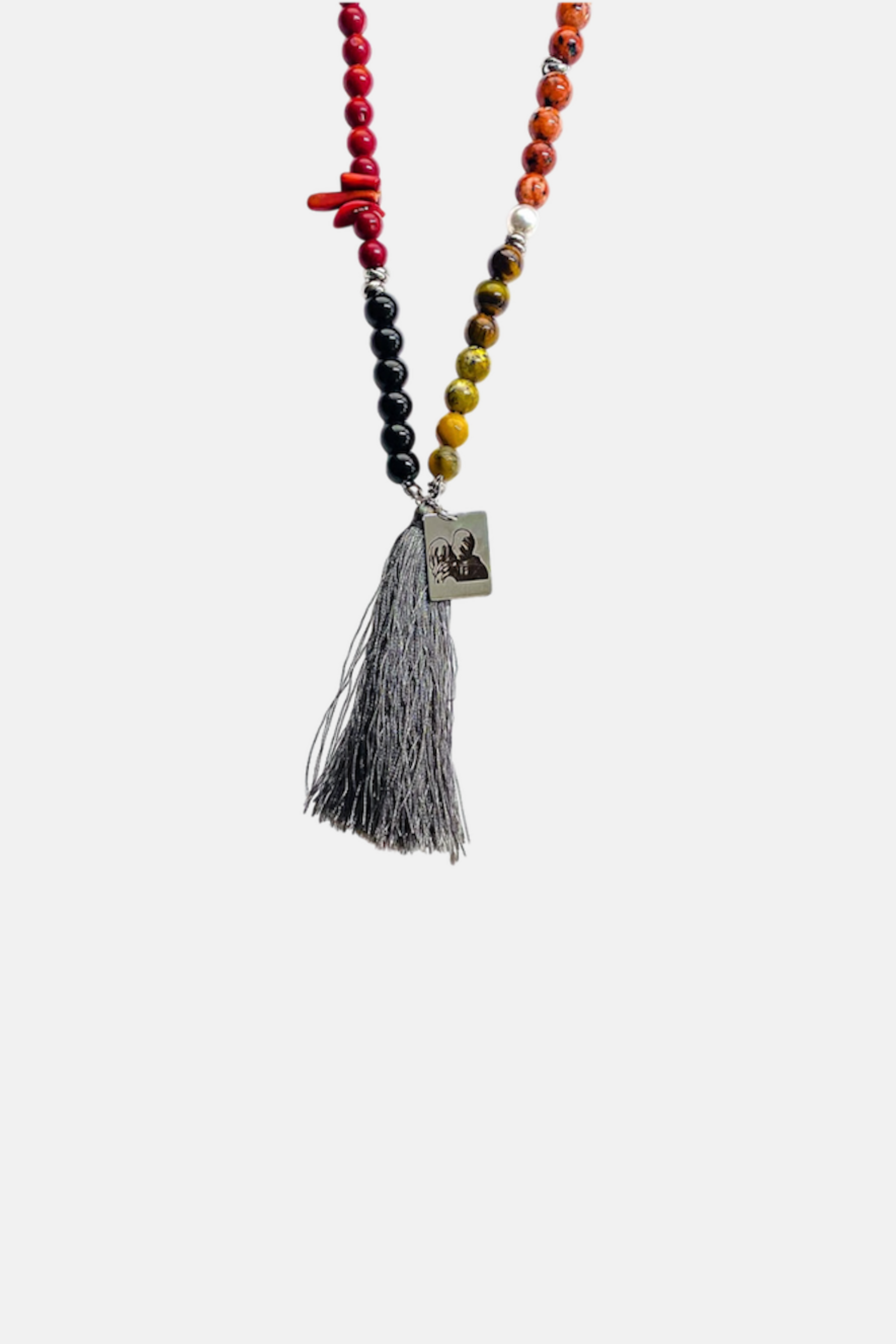I suoi colori cupi ma pieni di speranza e il suo profondo significato ci hanno spinto a realizzare LA PRIMA COLLANA AL MONDO IN PIETRA ispirata da "Gli Amanti" di Magritte. Una collana in stile Mala Tibetano realizzata a mano con pietre di Agata in vari colori, Diaspro Giallo, Lapislazzuli Blu, Onice Nera, Ambra, Perle d'acqua dolce e Pasta di Corallo con nappina in Grigio Perla e targhetta in Acciaio 316L con raffigurazione del quadro incisa.