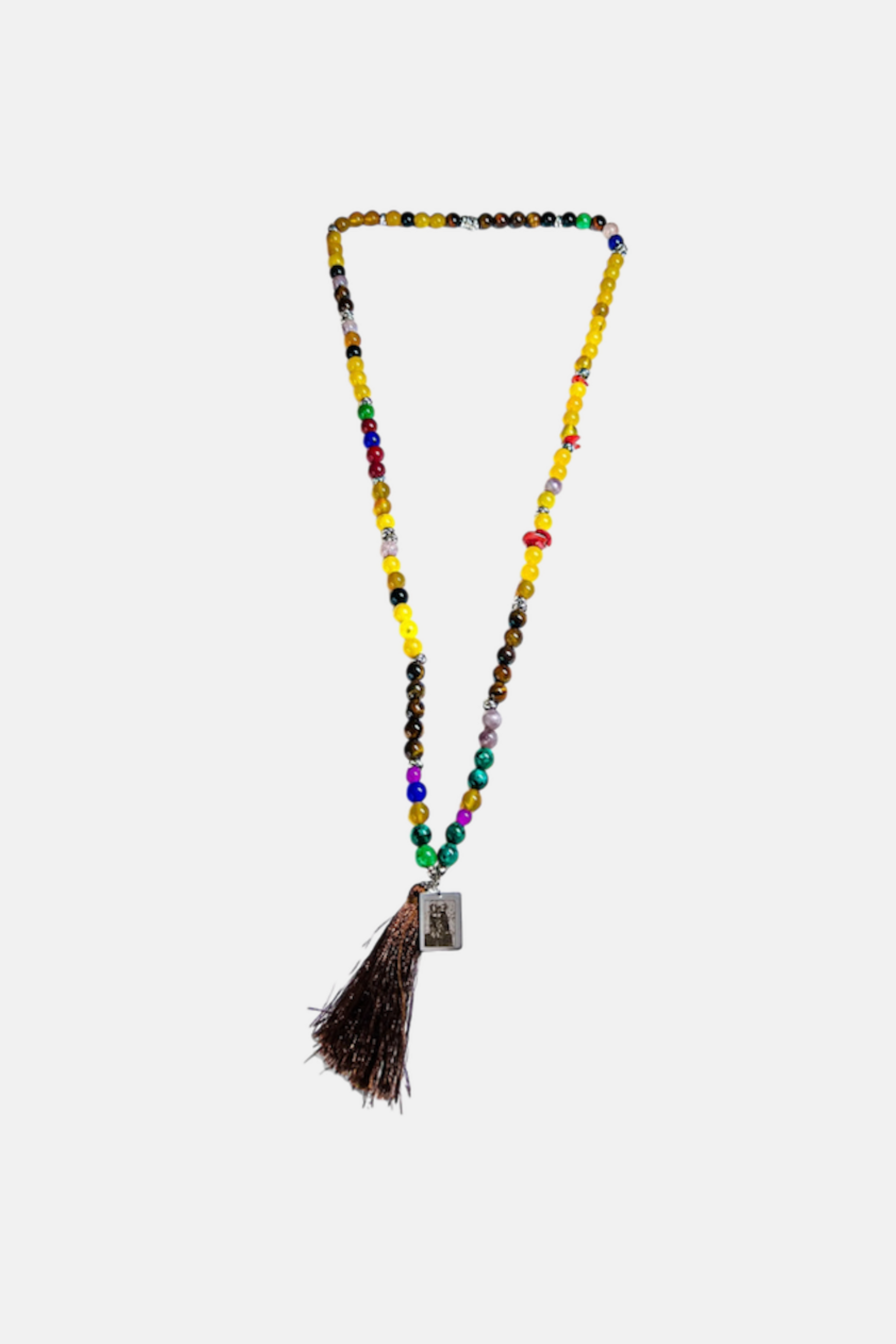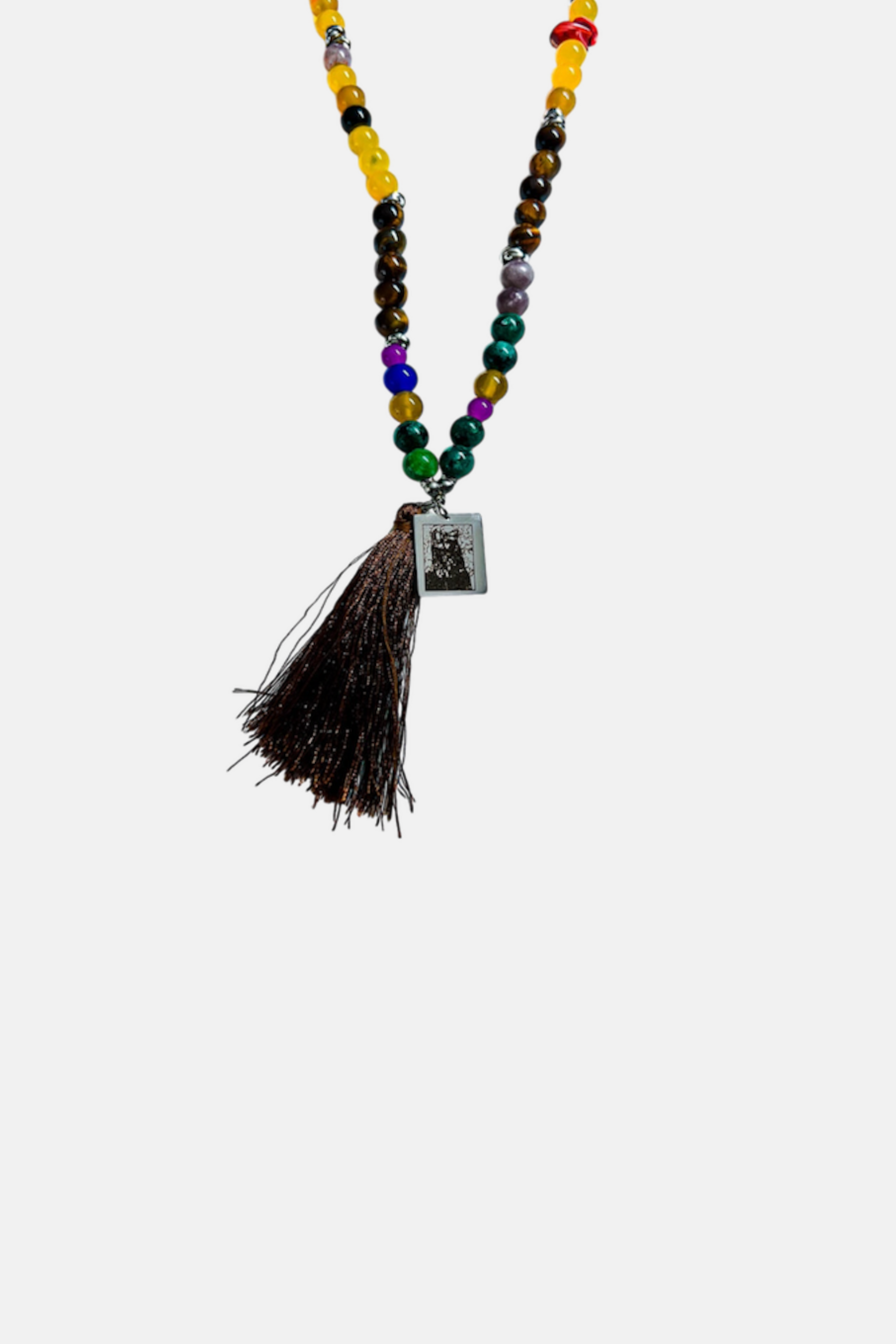 Una collana in stile Mala Tibetano realizzata a mano con pietre di Agata di vari colori con componente dominante l'Agata Gialla, Occhio di Tigre e Diaspro Azzurro, con nappina in Marrone e targhetta in Acciaio 316L con raffigurazione del quadro incisa.