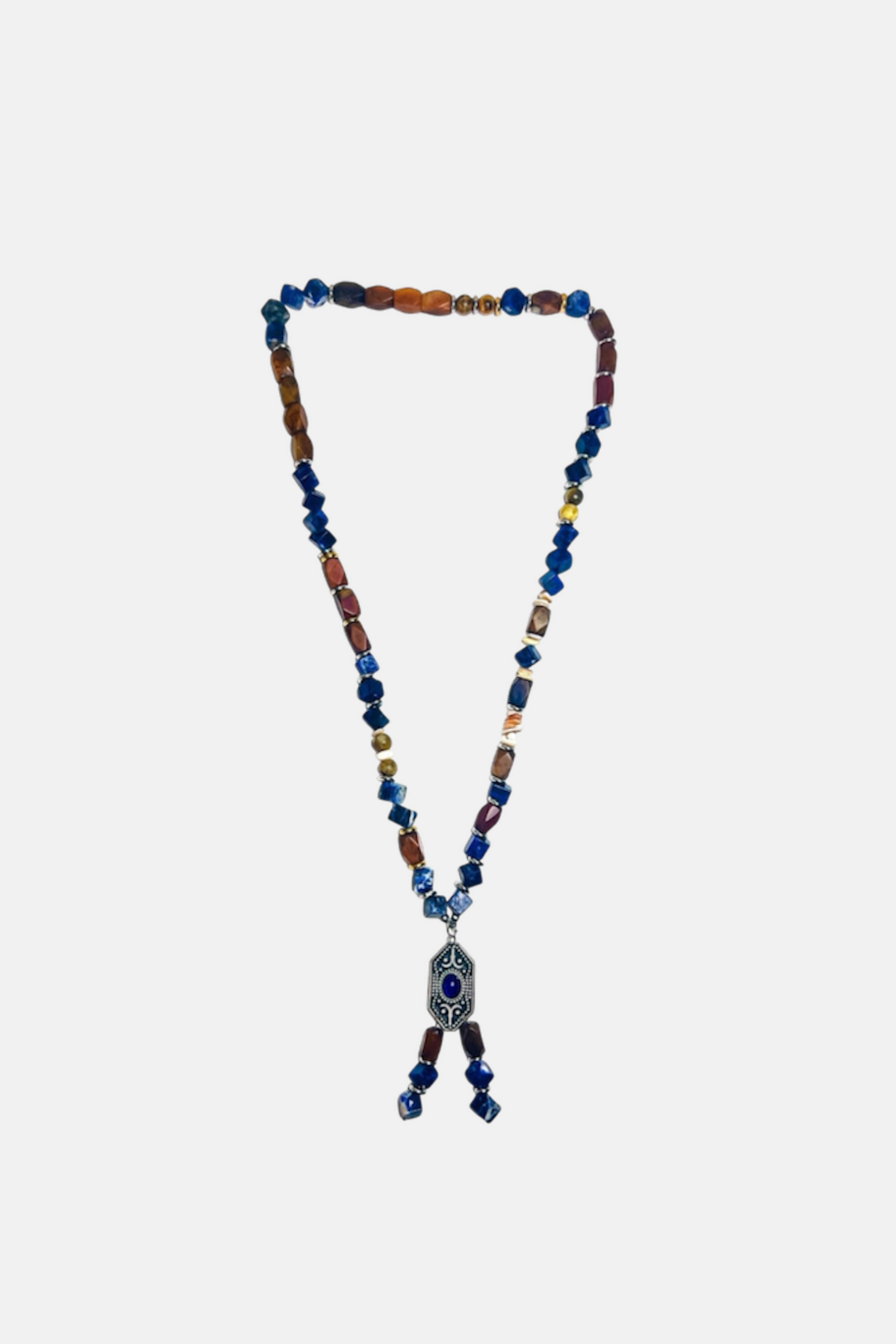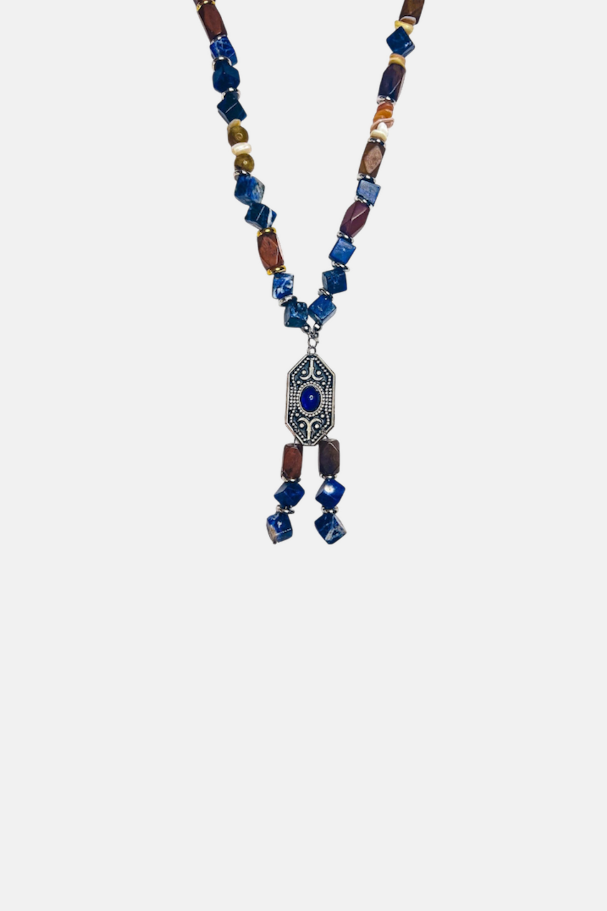 Primordiale nelle forme e nelle asimmetrie, ispirata agli accessori delle tribú indigene per un fascino Wild che cattura l’attenzione di chiunque: INDIGENO, una collana in stile Mala Tibetano realizzata a mano con pietre di Quarzo Quadrato Blu, Ambra Rettangolare, Agata Gialla, pezzi di Conchiglia Bianca asimmetrica, intermezzi in Acciaio 316L e placchetta centrale in Zamak con pietra di Agata Blu centrale.