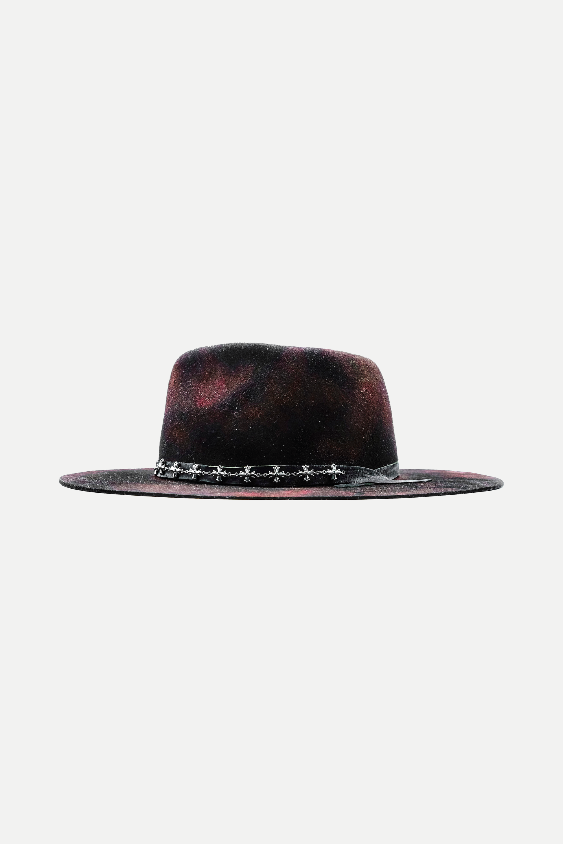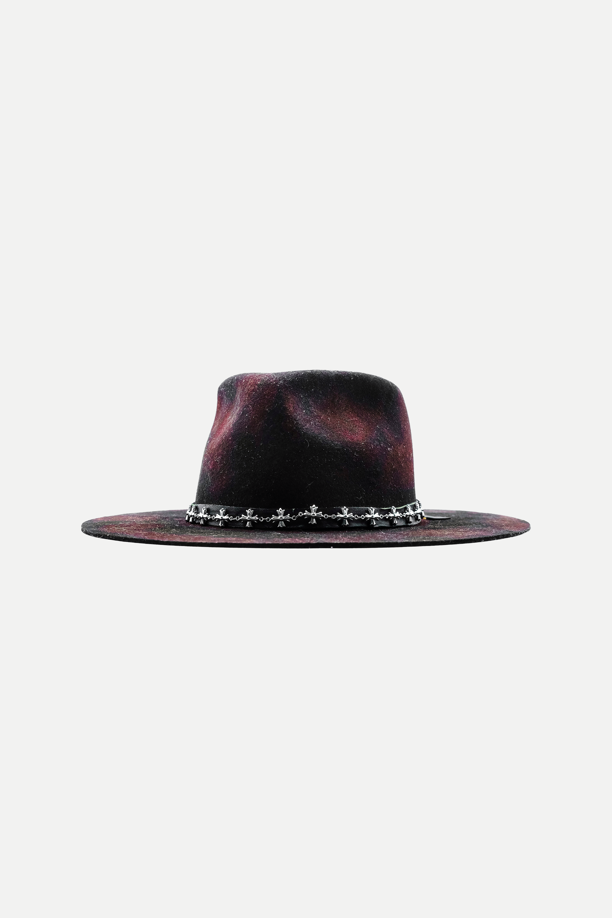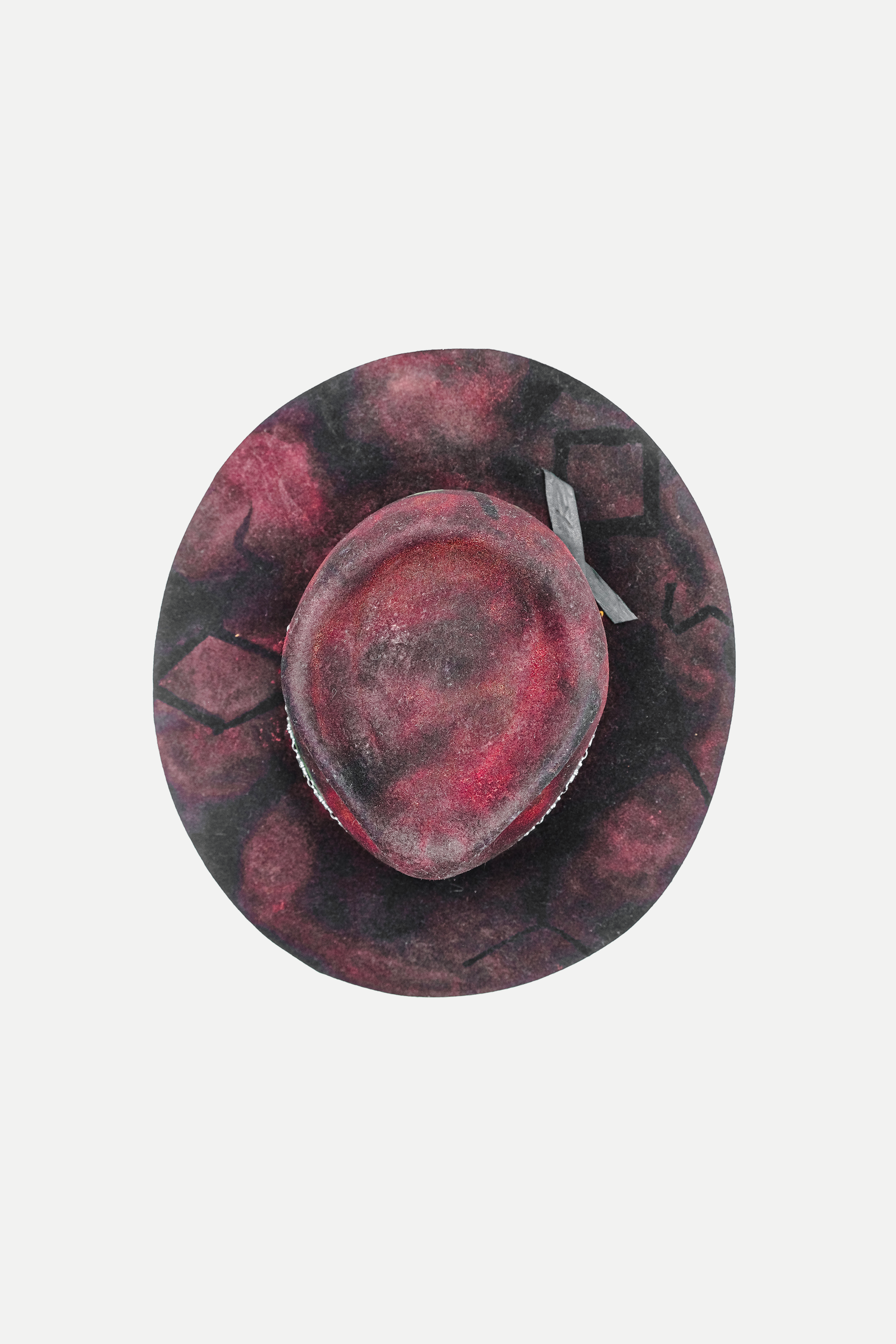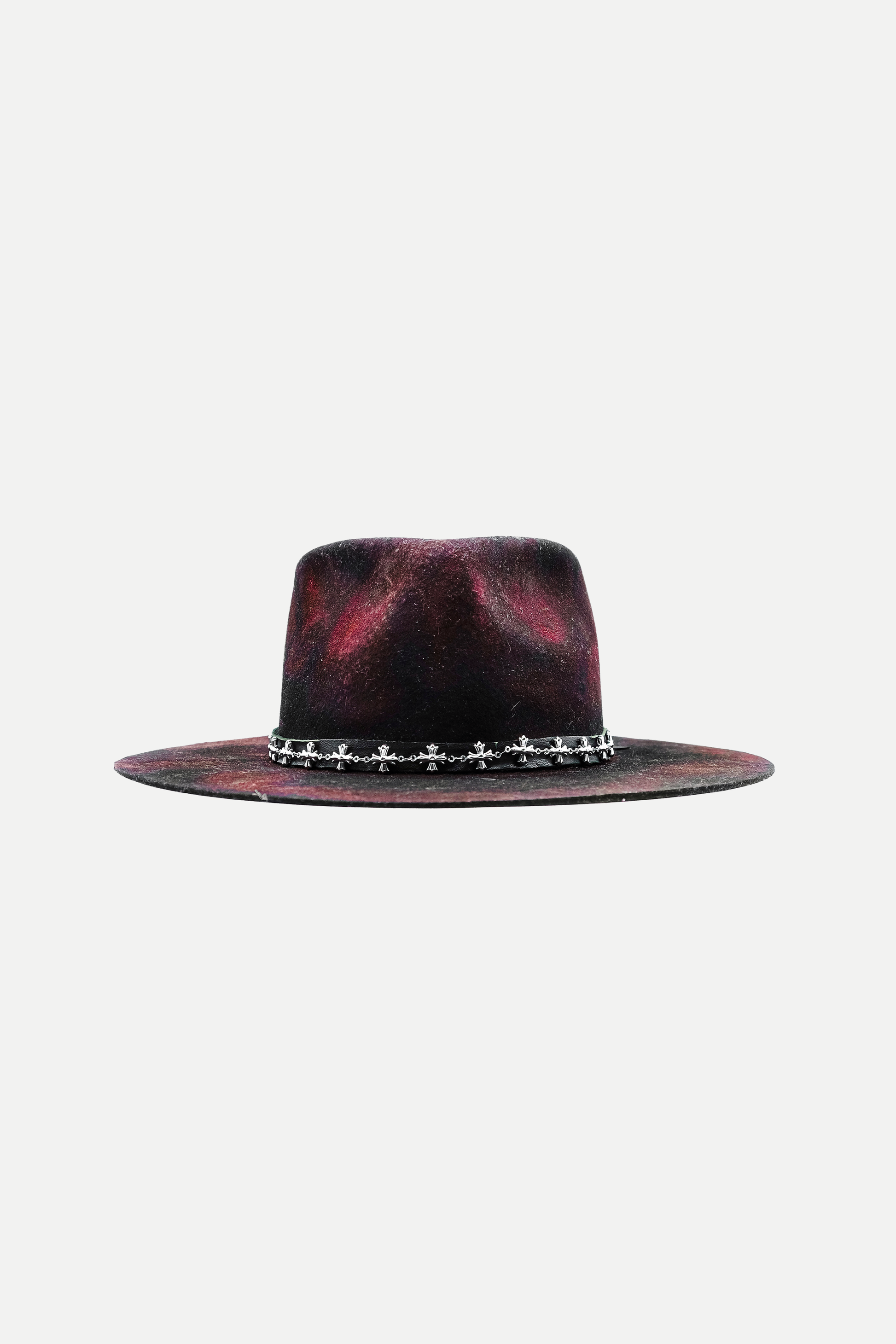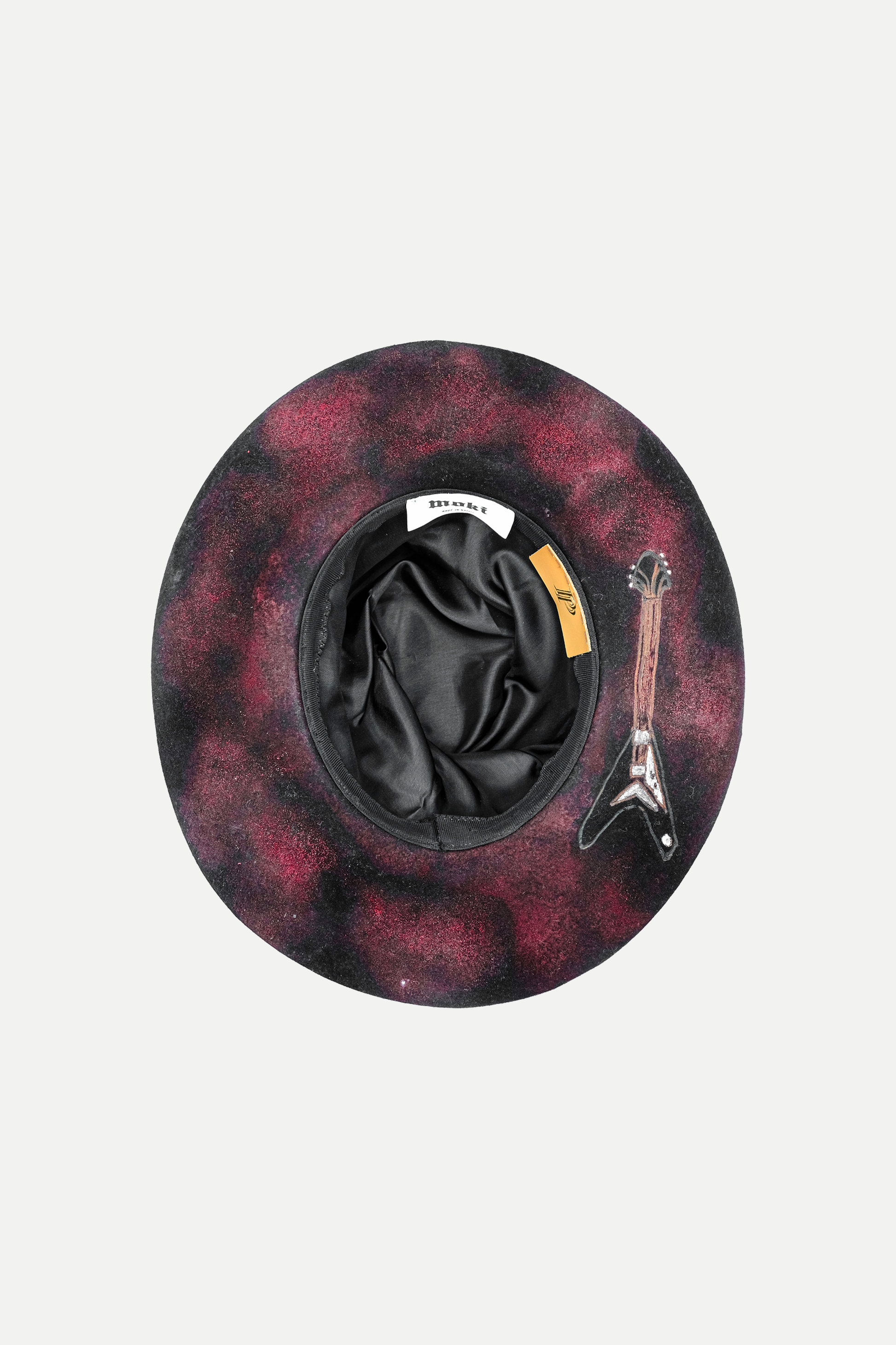 Ispirato all'icona rock, il Jimi Hendrix è un cappello Fedora realizzato a mano in puro feltro di coniglio Premium, con texture che richiama un effetto pitonato ed effetti di chiaroscuro rosso e nero, microfascia in pelle nera con pendente a croci in Acciaio 316L ed incisione della chitarra di Jimi, la "Flying V", sotto la falda.