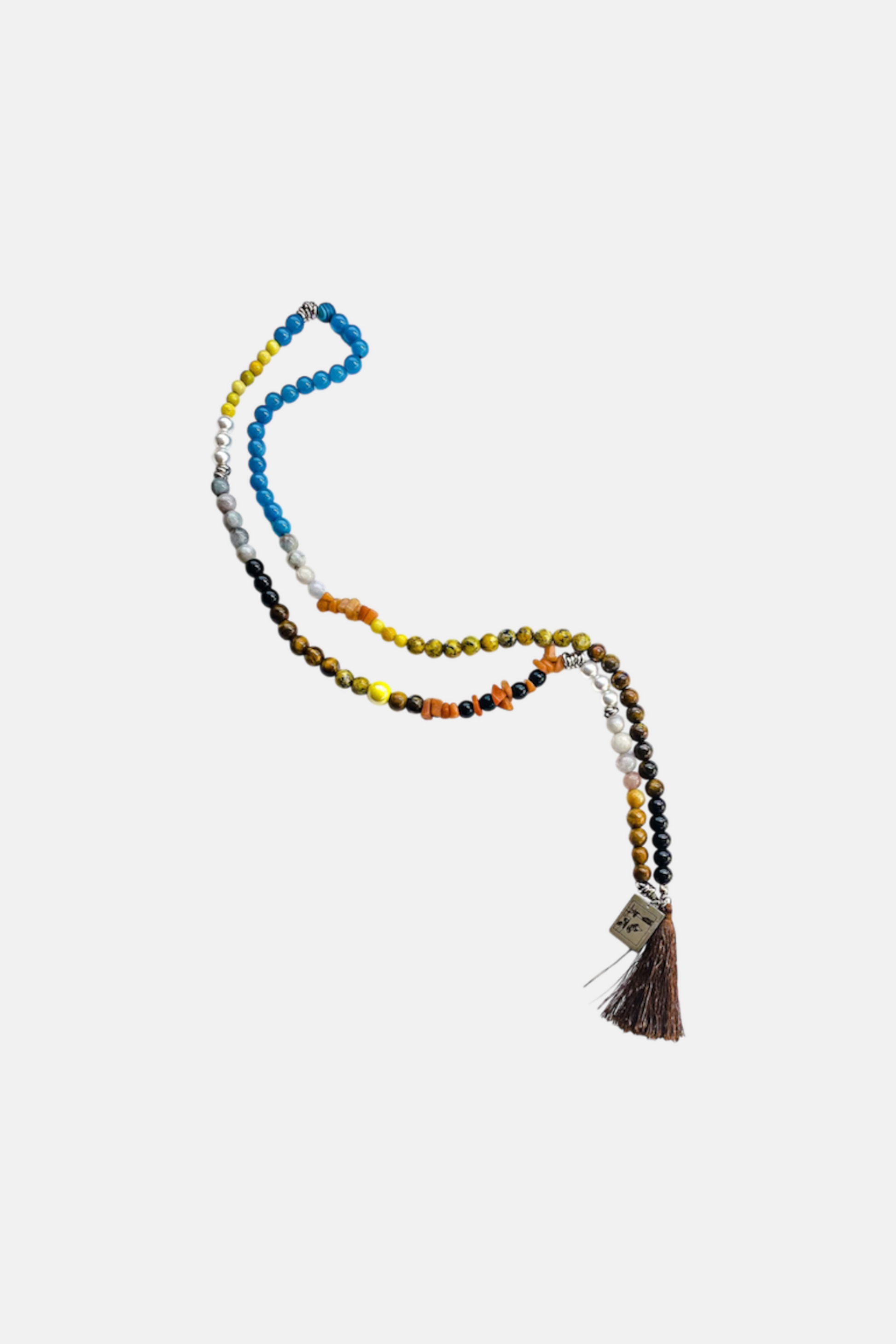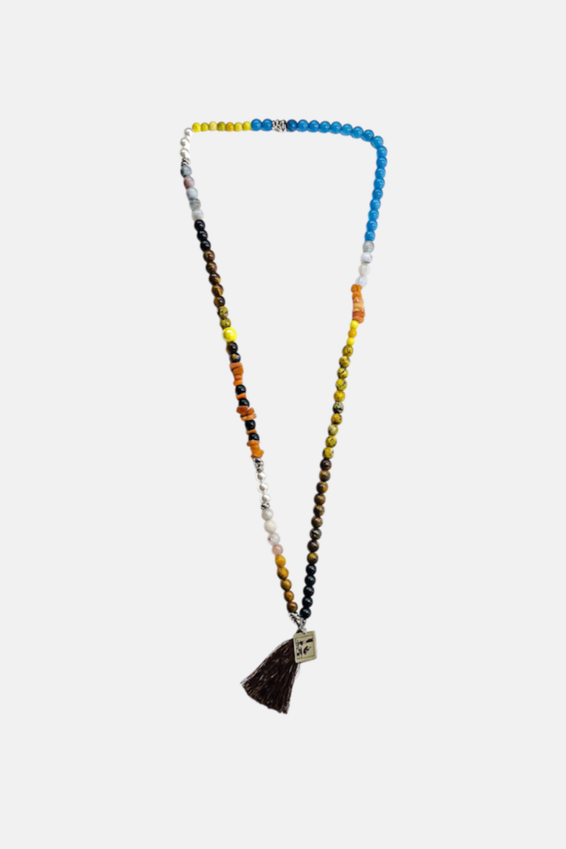 Un dipinto dai colori caldi quanto il suo profondo significato che riflette la profondità della natura umana, che ci ha spinto a realizzare LA PRIMA COLLANA AL MONDO IN PIETRE ispirata da "La persistenza della Memoria" di Dalì. Una collana in stile Mala Tibetano realizzata a mano con pietre di Agata in vari colori, Occhio di Tigre, Onice Nera, Diaspro Giallo, Ambra e Perle d'acqua dolce con nappina in Marrone e targhetta in Acciaio 316L con raffigurazione del quadro incisa.