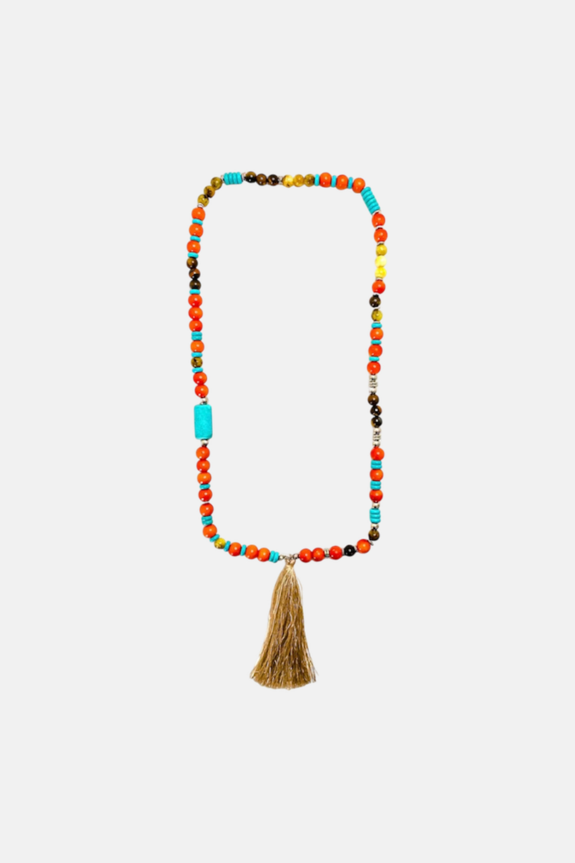 I colori di questa estate sono sgargianti ma stilosi, perché ognuno merita di brillare. Ci siamo ispirati ai colori della “Magic Hour”, il tramonto più bello mai visto dove il cielo sembra una tavolozza d’artista. Nasce così la nostra MACARENA, una collana realizzata a mano in stile Mala Tibetano con pietre di Agata Arancione, rondelle di Pasta di Turchese, Agata Gialla, Occhio di Tigre, una pietra rettangolare di Pasta di Turchese e intermezzi in Acciaio 316L con nappina beige.