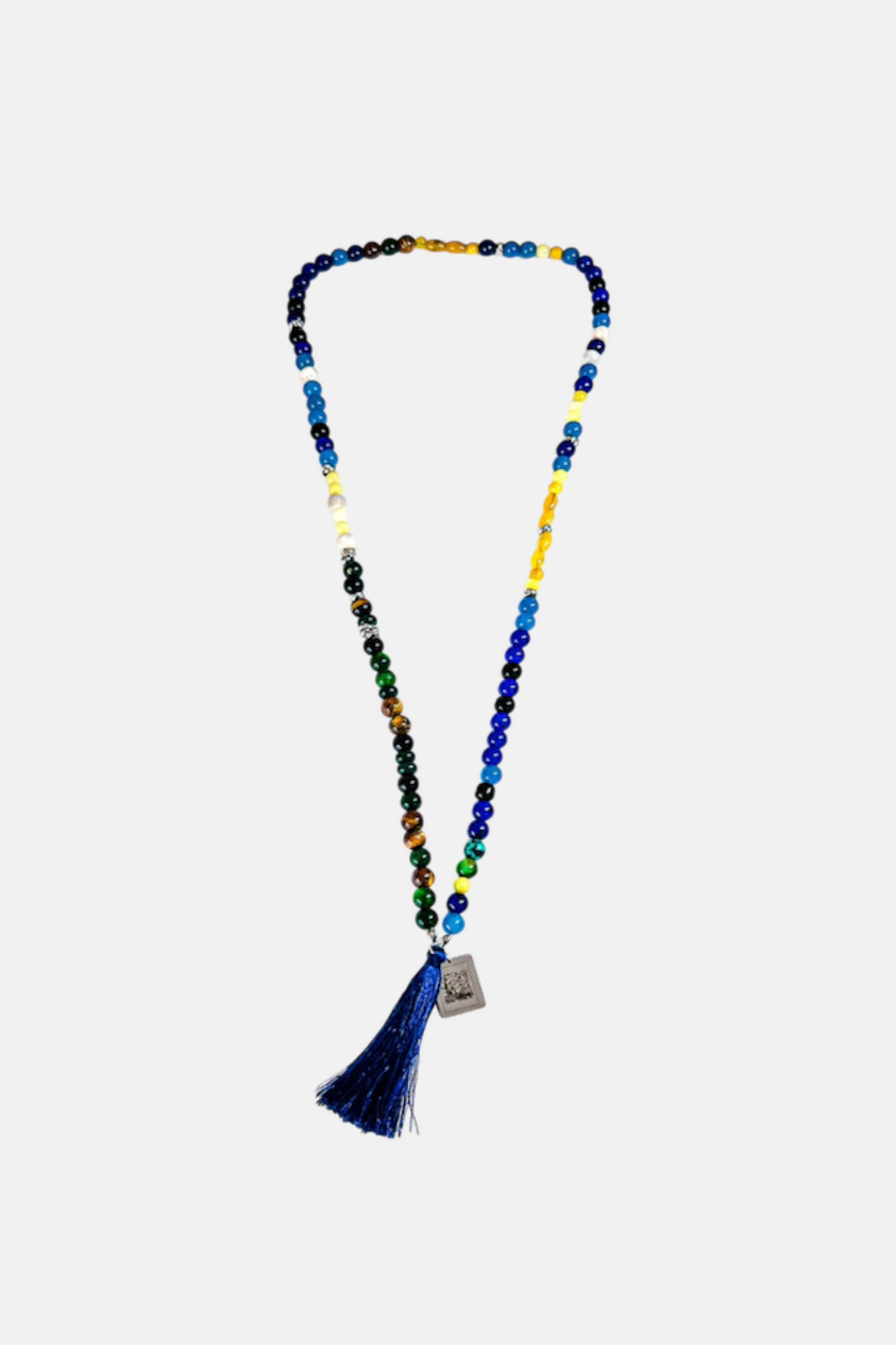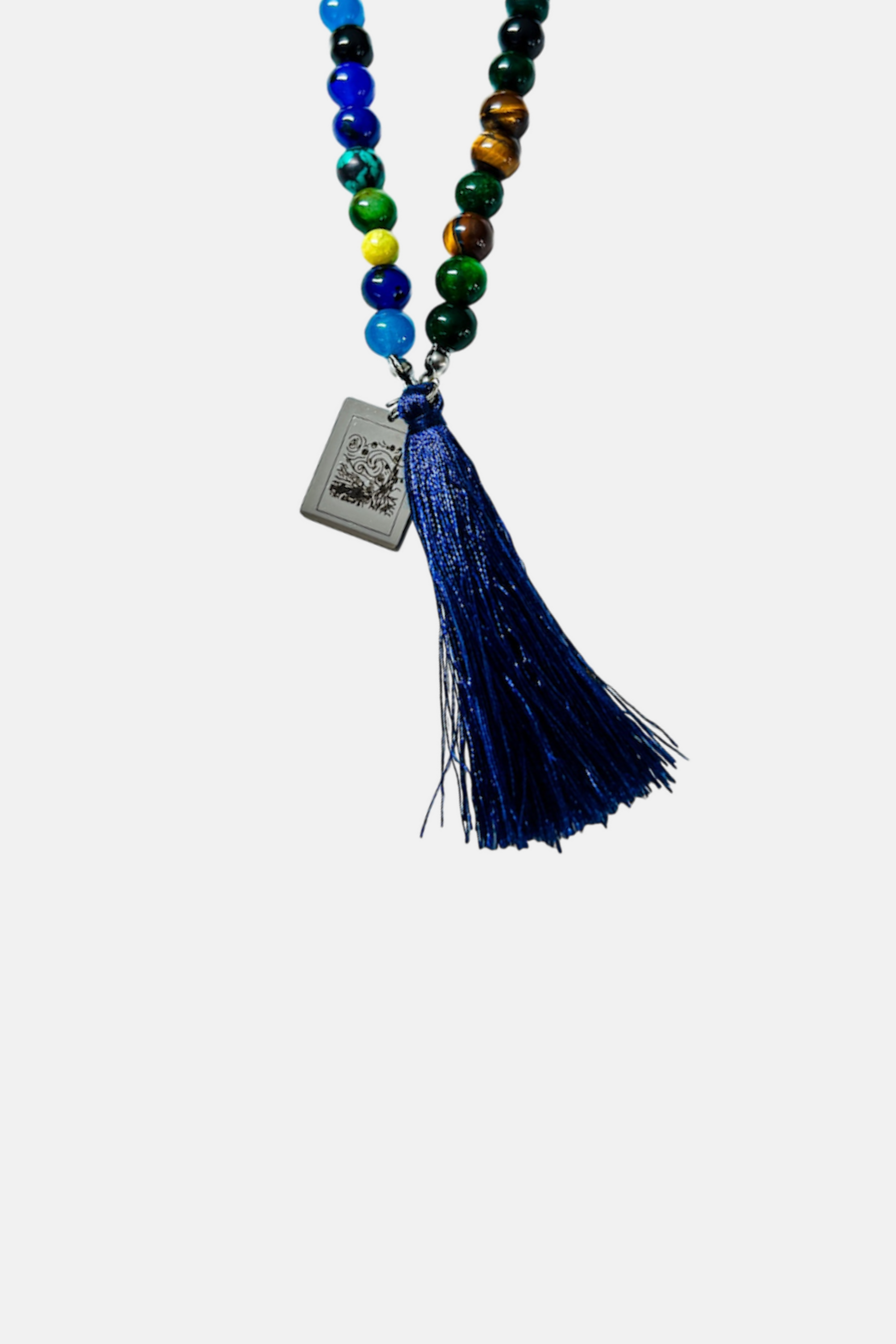 Realizzata a mano in stile Mala Tibetano con pietre di Agata di vari colori e forme, Pasta di Turchese, Occhio di Tigre e Howlite, con nappina Blu Eettrico e targhetta in Acciaio 316L con raffigurazione del quadro inciso.