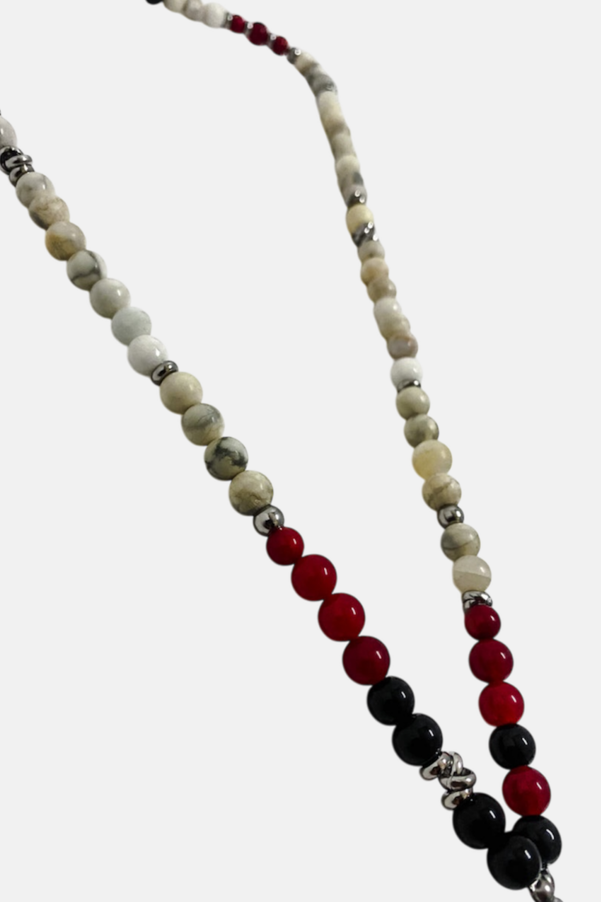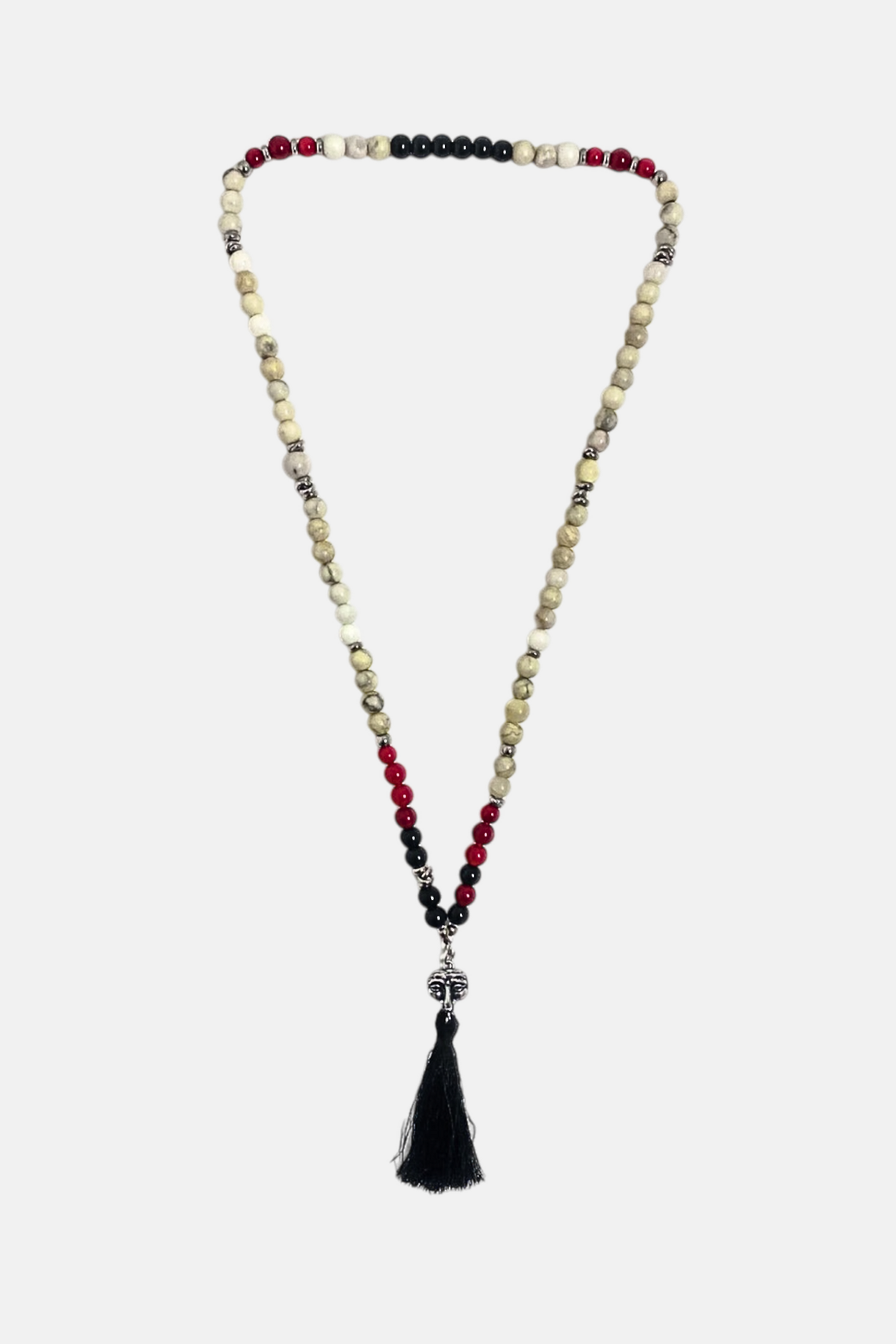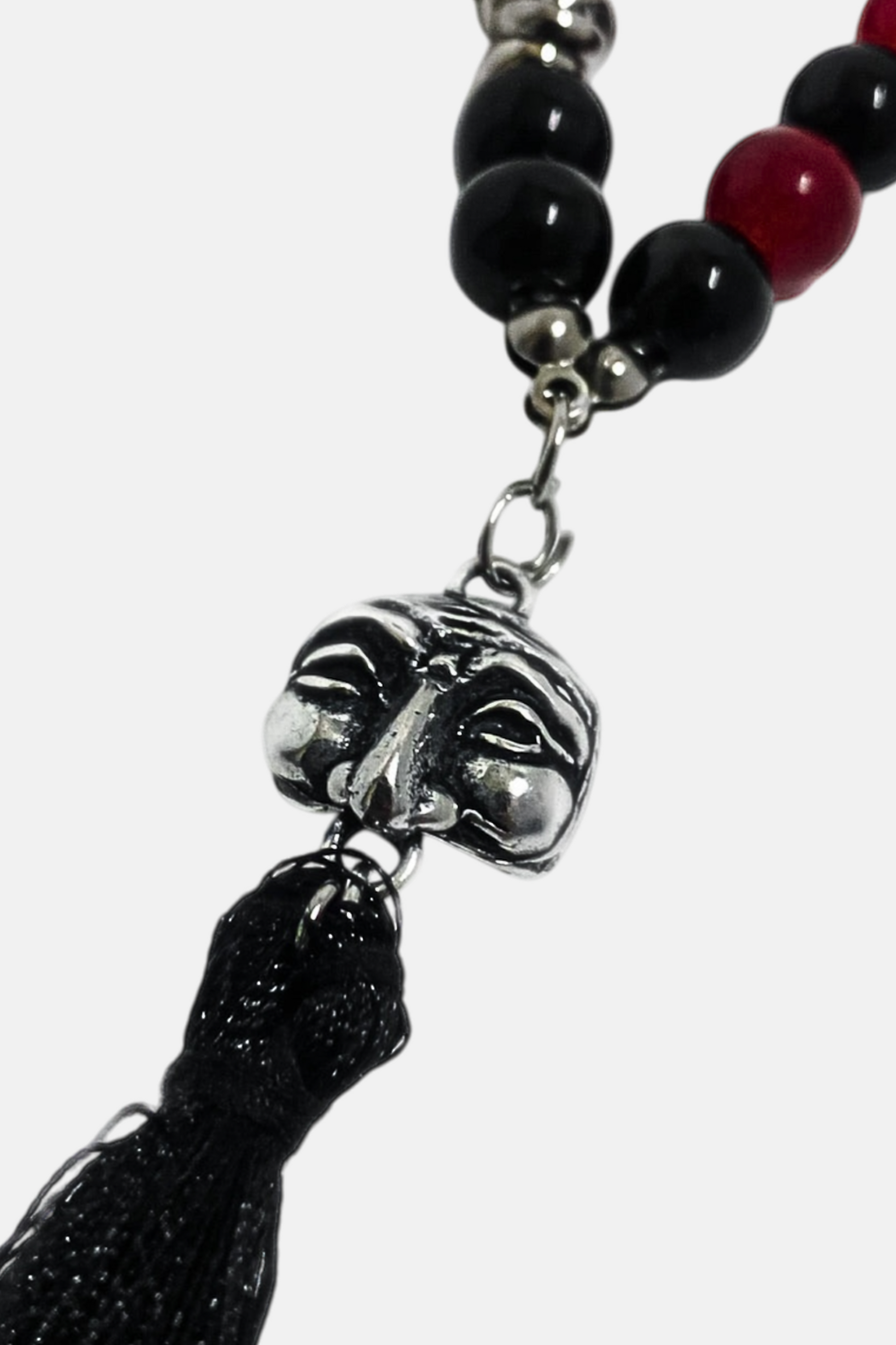 E' nata così la nostra PULLECENELLA - IL COSTUME, una collana in stile Mala Tibetano, realizzata a mano con pietre di Howlite, Agata Rossa, Agata Nera ed intermezzi in Acciaio 316L, con targhetta raffigurante Pulcinella a rilievo in Zamak, e la classica nappina che contraddistingue la collana in colorazione Nero.