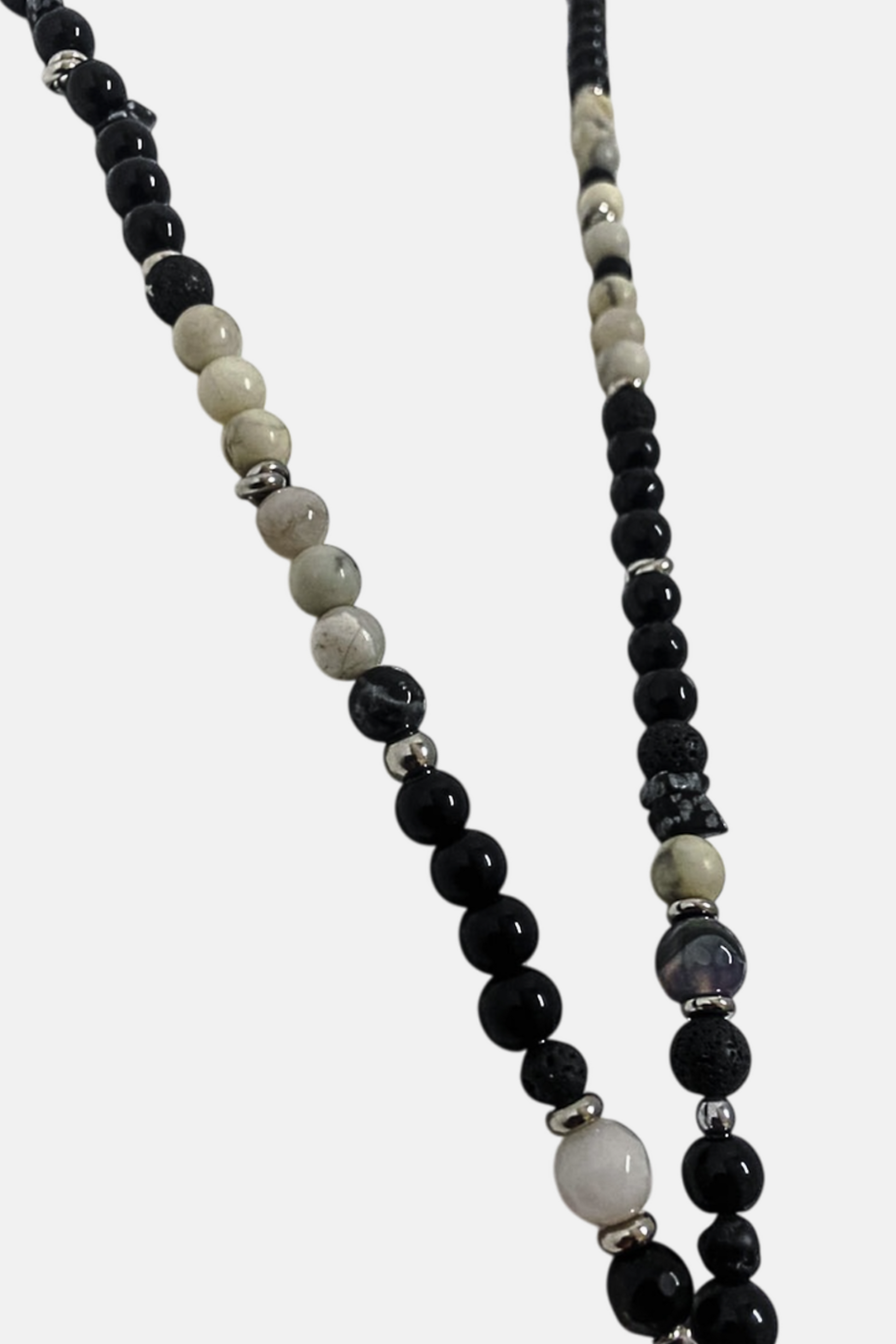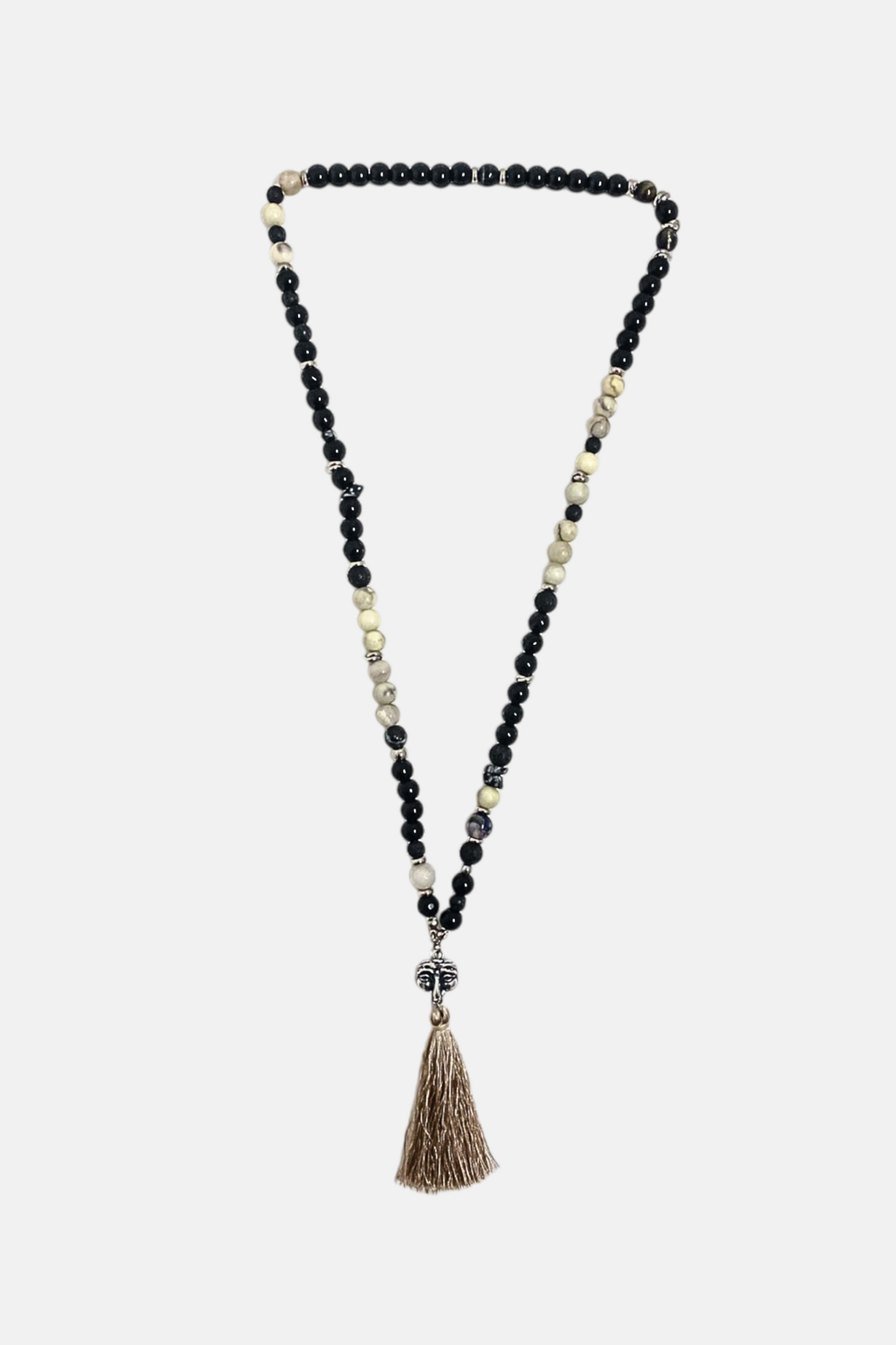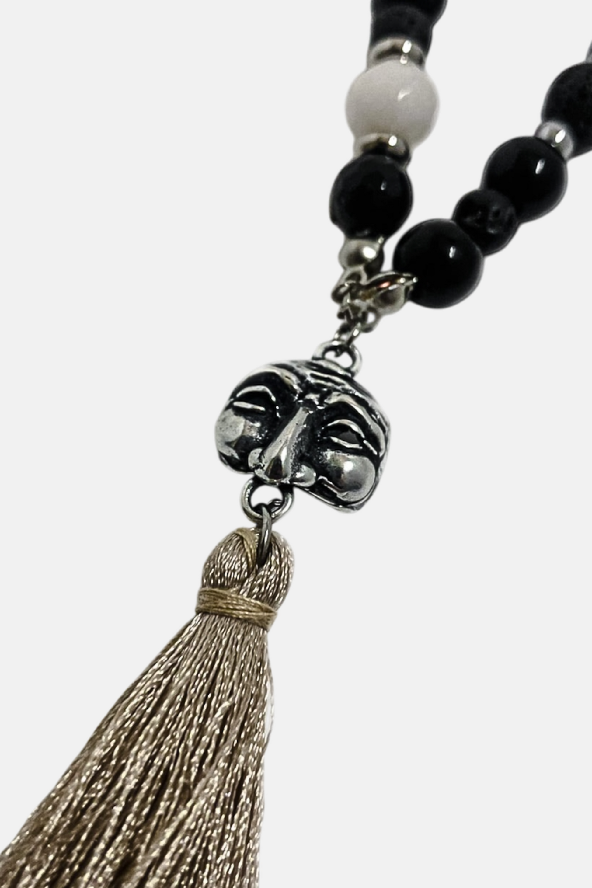 E' nata così la nostra PULLECENELLA - LA MASCHERA, una collana in stile Mala Tibetano, realizzata a mano con pietre di Agata Nera, pietre di Howlite, pietrine di ed intermezzi in Acciaio 316L, con targhetta raffigurante Pulcinella a rilievo in Zamak e la classica nappina che contraddistingue la collana in colorazione Beige.