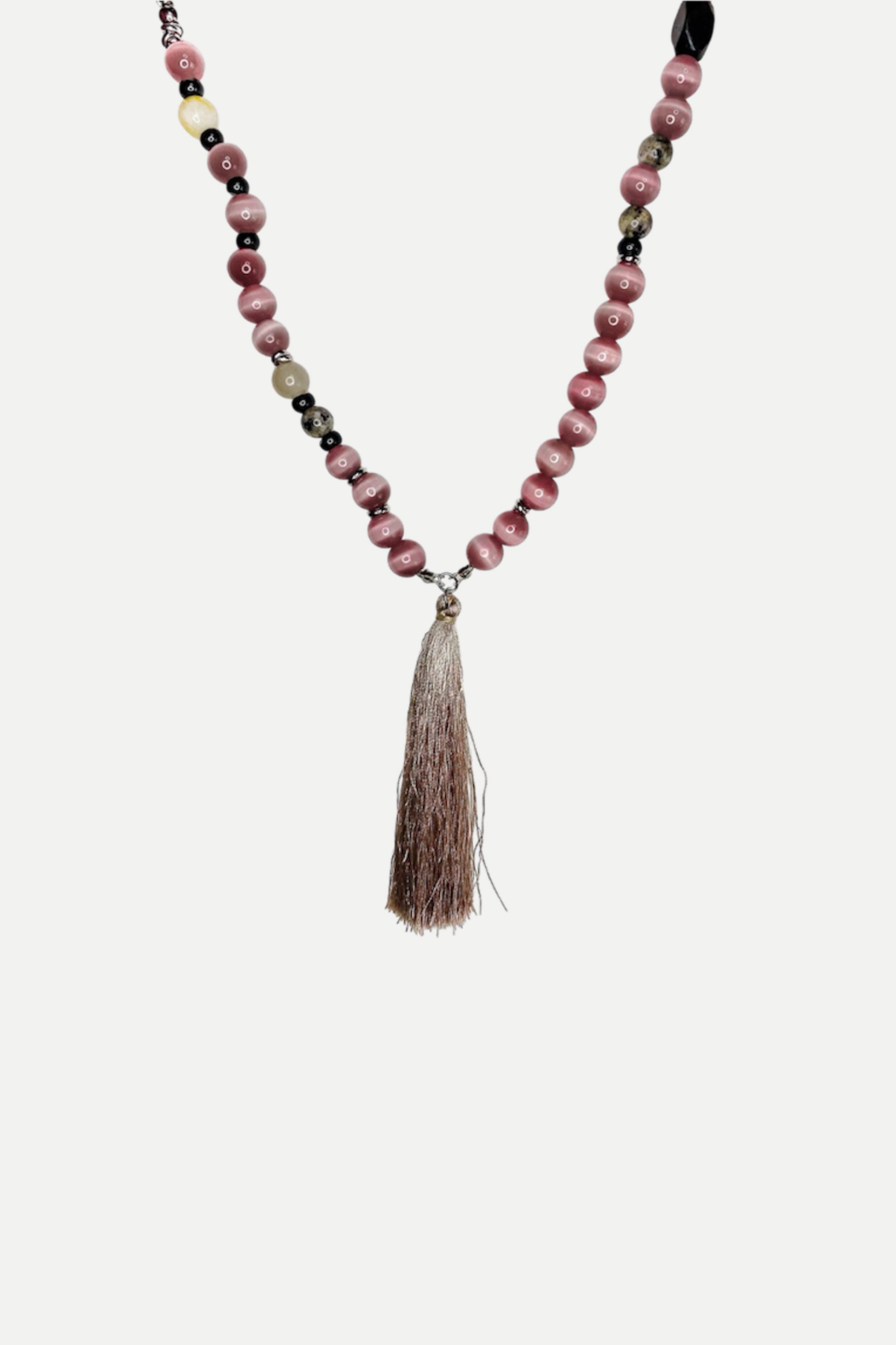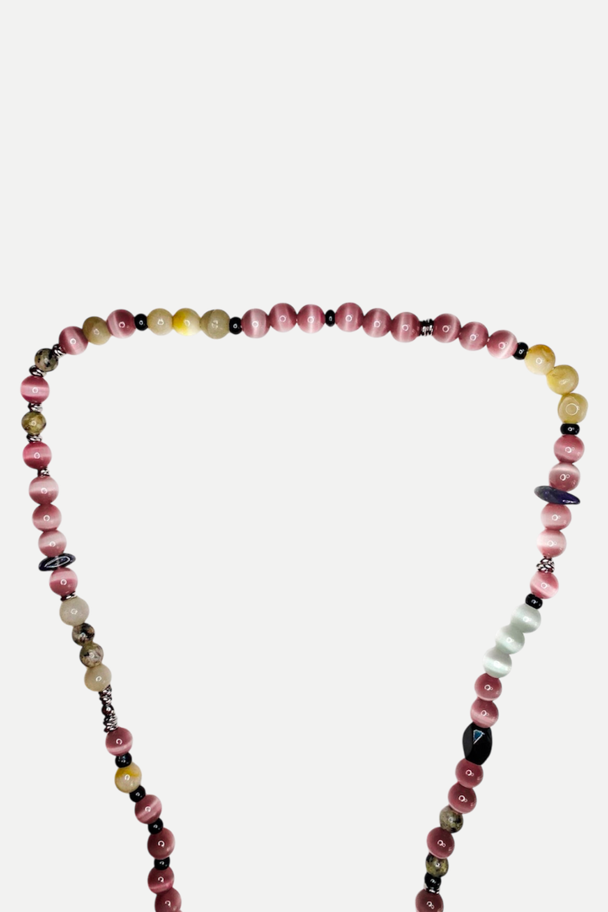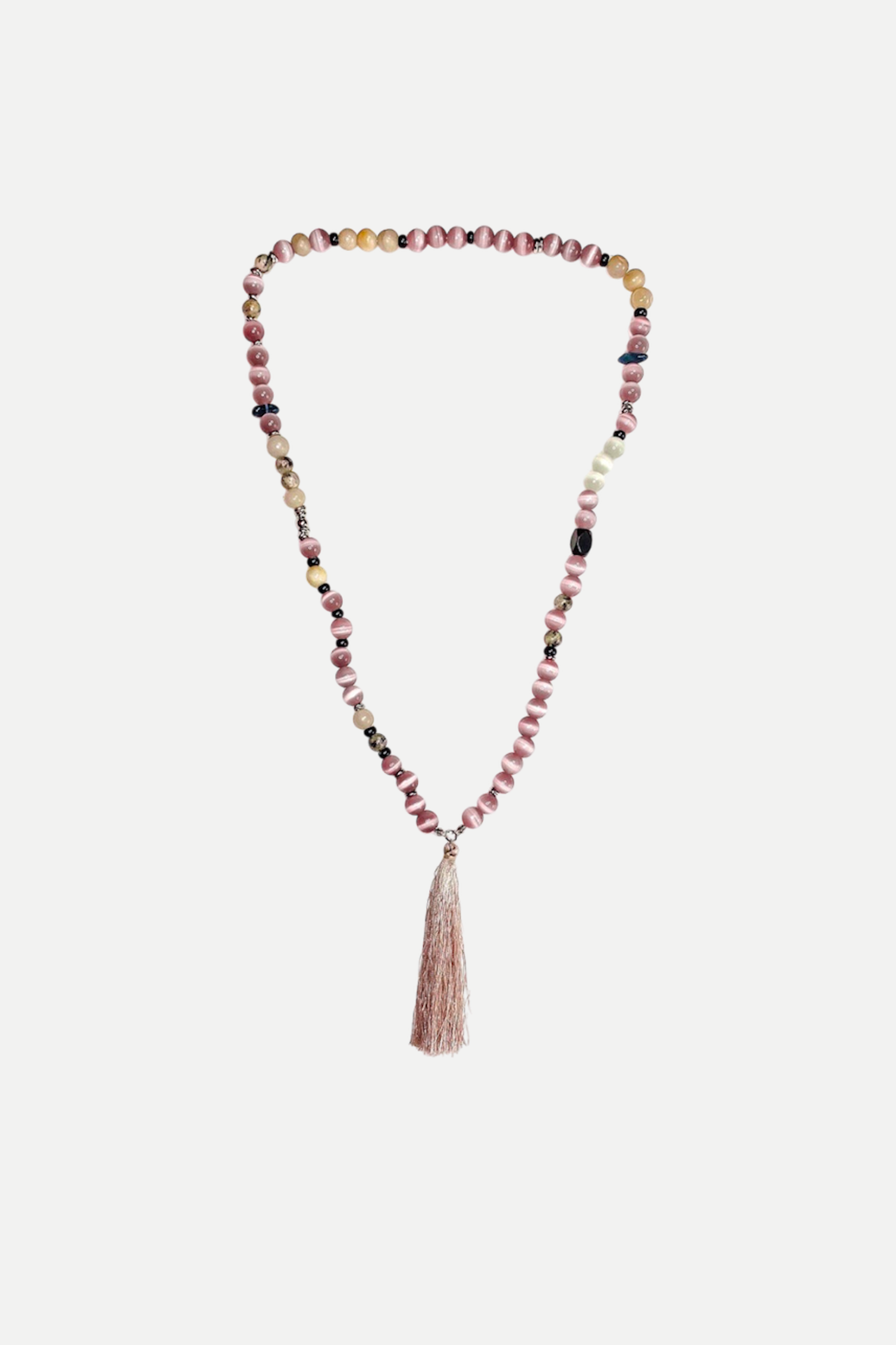 Ispirata al magico “Lago Rosa” di Retba, in Africa, la collana RETBA richiama i colori magici di uno dei capolavori della natura. Realizzata a mano in stile Mala Tibetano con pietre di Occhio di Gatto Rosata, Occhio di Gatto Bianca, Agata Gialla, Ametista, rondelle di Onice Nera e intermezzi in Acciaio 316L.