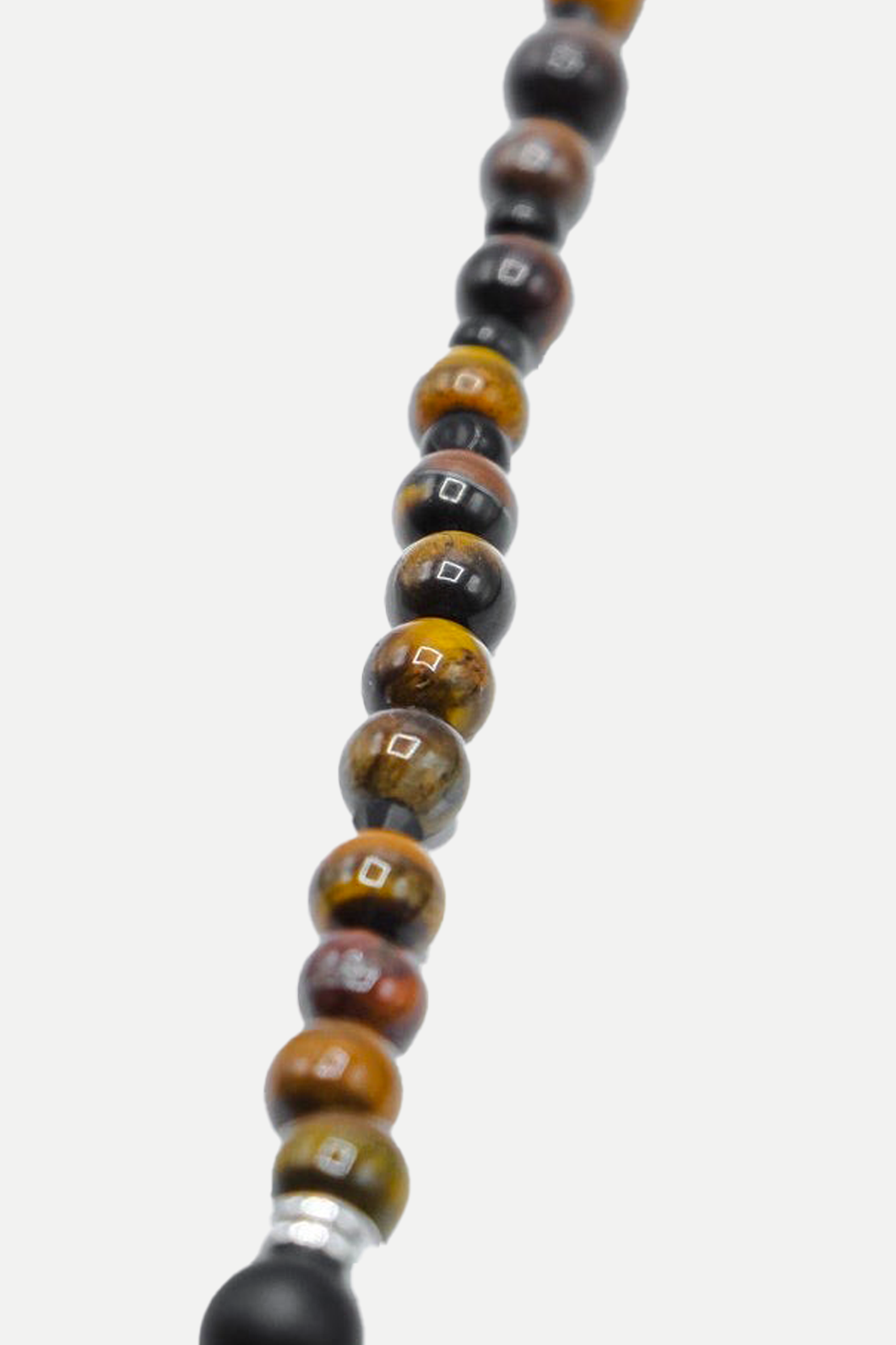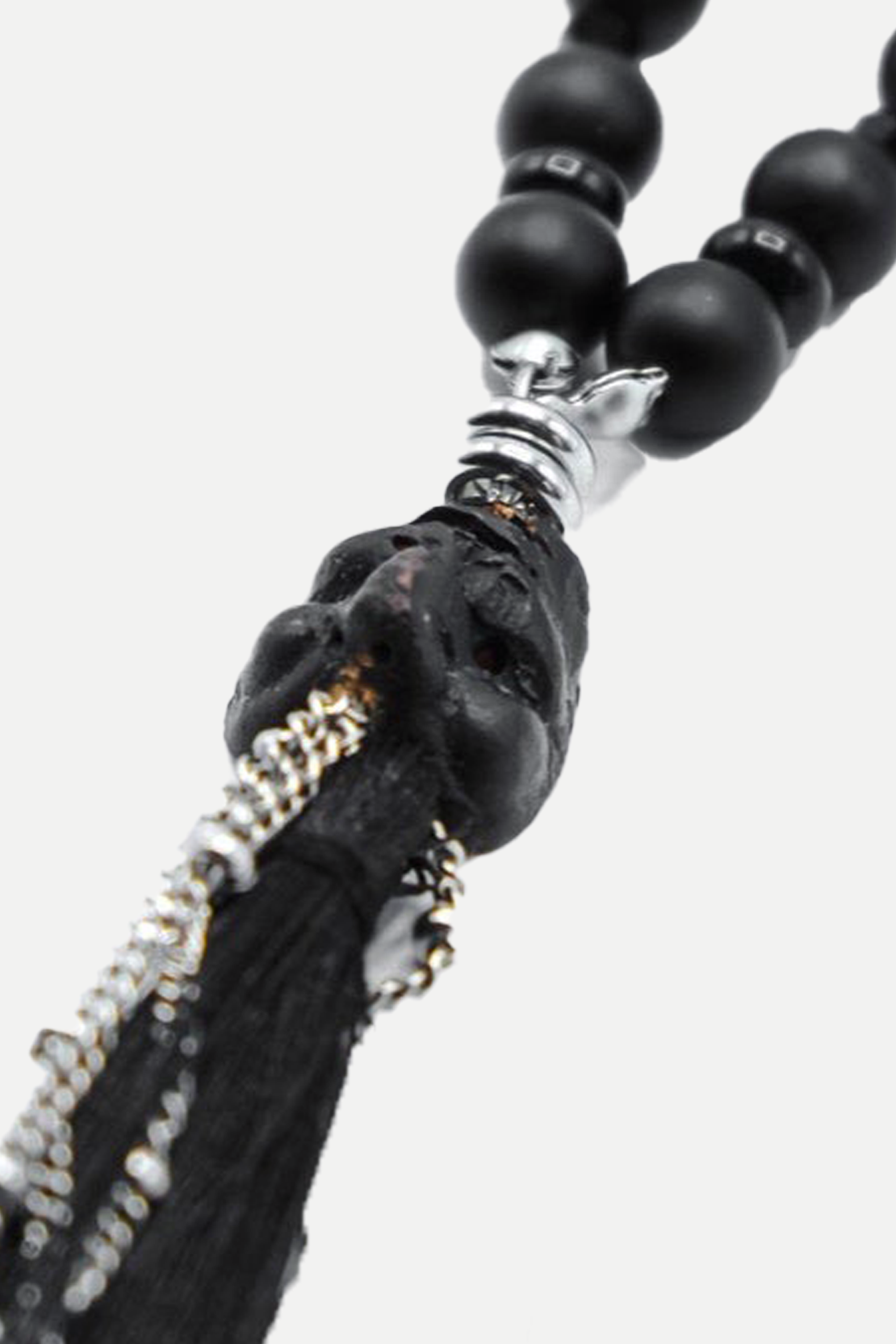 Un simbolo cult, dalla collezione CULT. La maschera più famosa di Napoli come non è stata mai vista, per la prima volta in chiave rock. Realizzata a mano in stile Mala Tibetano con pietre di Agata Nera Opaca, rondelle e rombi sfaccettati di Onice Nero, Occhio di Tigre e intermezzi in Acciaio 316L con pendente maschera di Pulcinella nera in ceramica e nappina nera intervallata da nappina in fili di acciaio.