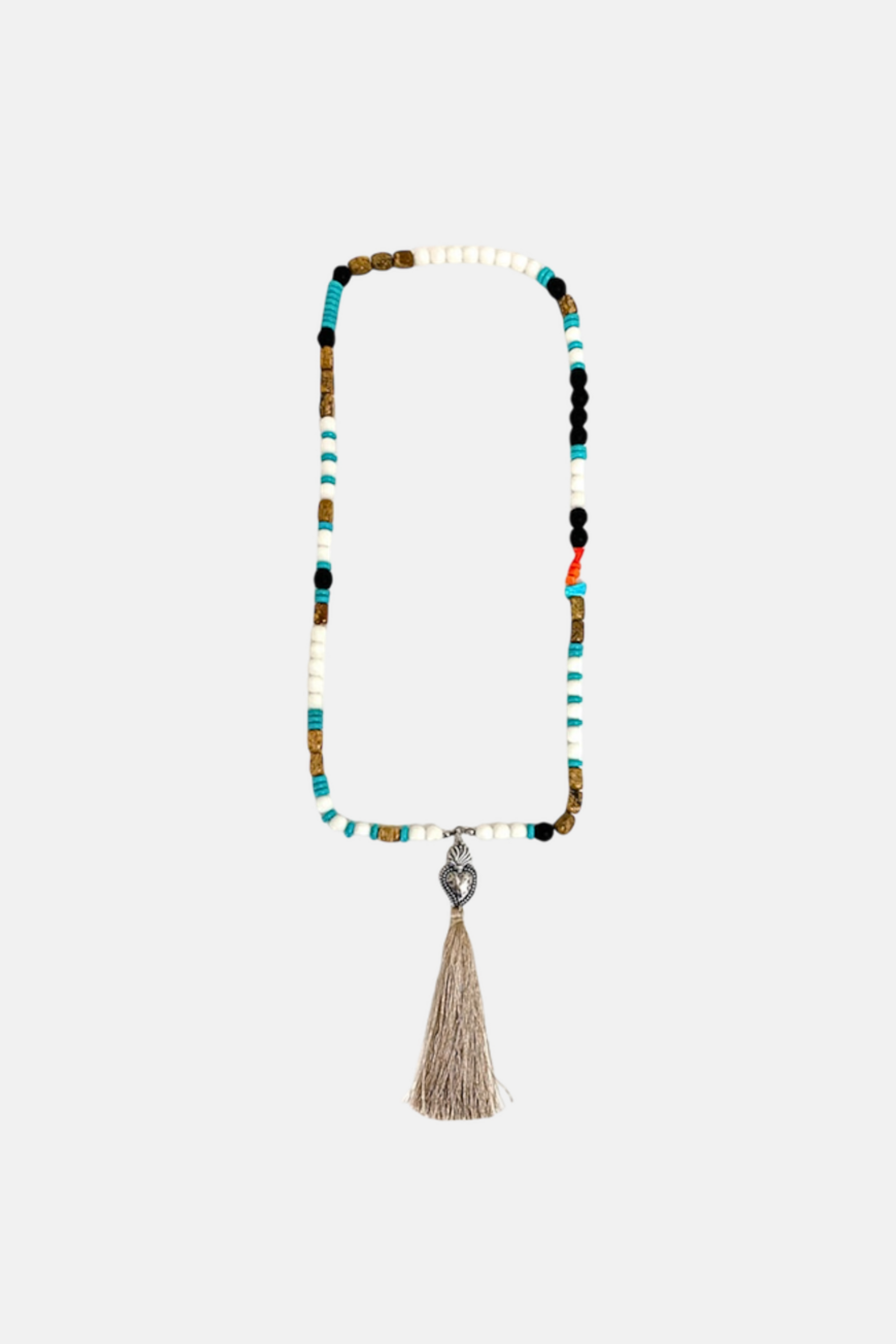 La simbologia partenopea incontra il fascino orientale. Sacro e Profano che si uniscono: nasce così la nostra SACRO CUORE WHITE, collana realizzata a mano in stile Mala Tibetano con pietre di Agata bianca opaca, Agata arancione asimmetrica, Agata nera opaca e pietre di Giada Marrone rettangolari con placchetta in Zamak del Sacro Cuore e nappina beige.