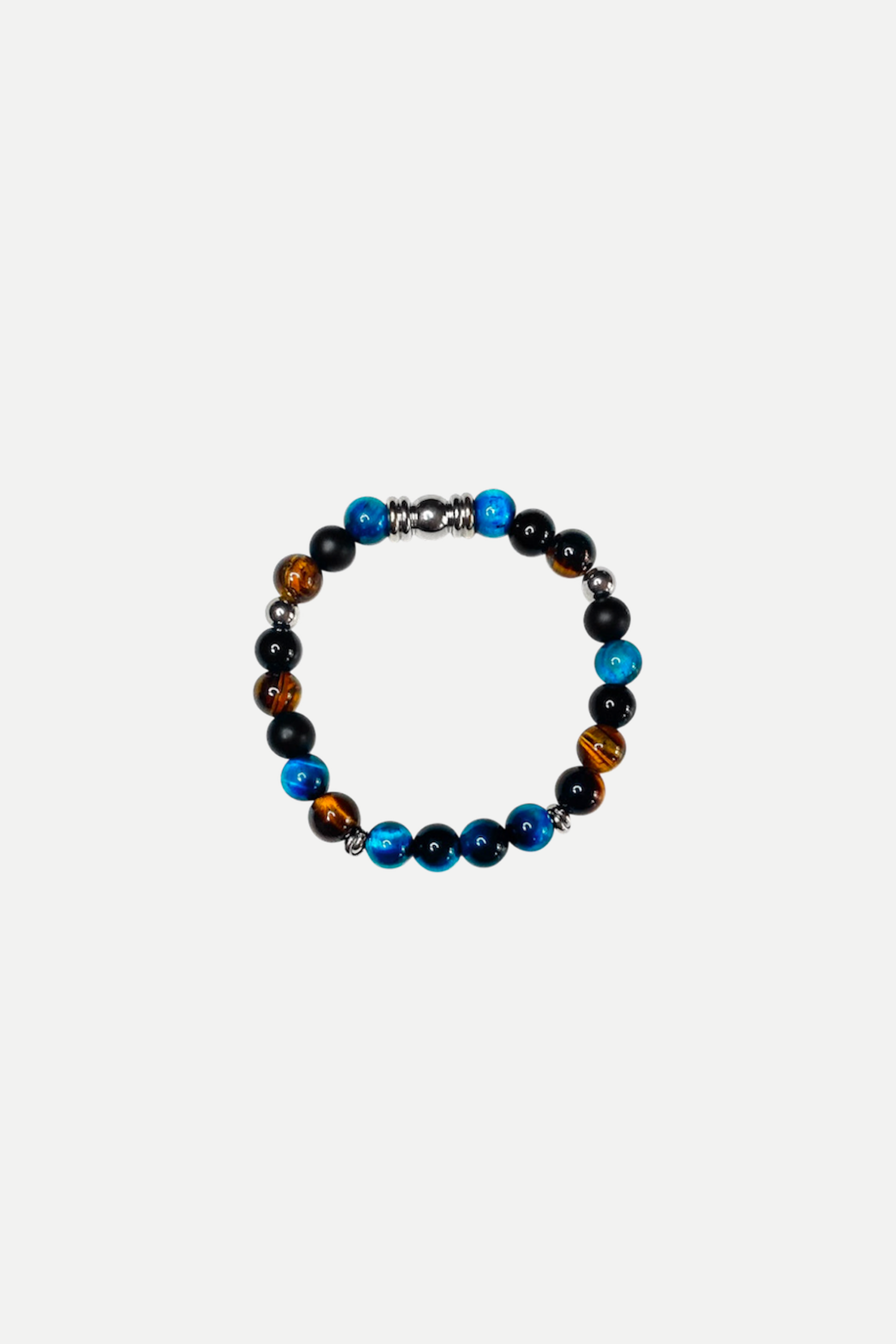 Dall’omonima collana, la versione bracciale SAUVAGE, realizzato a mano con pietre di Occhio di Tigre Blu, Occhio di Tigre Marrone, Agata Nera Opaca, Onice Nero e intermezzi in Acciaio 316L.