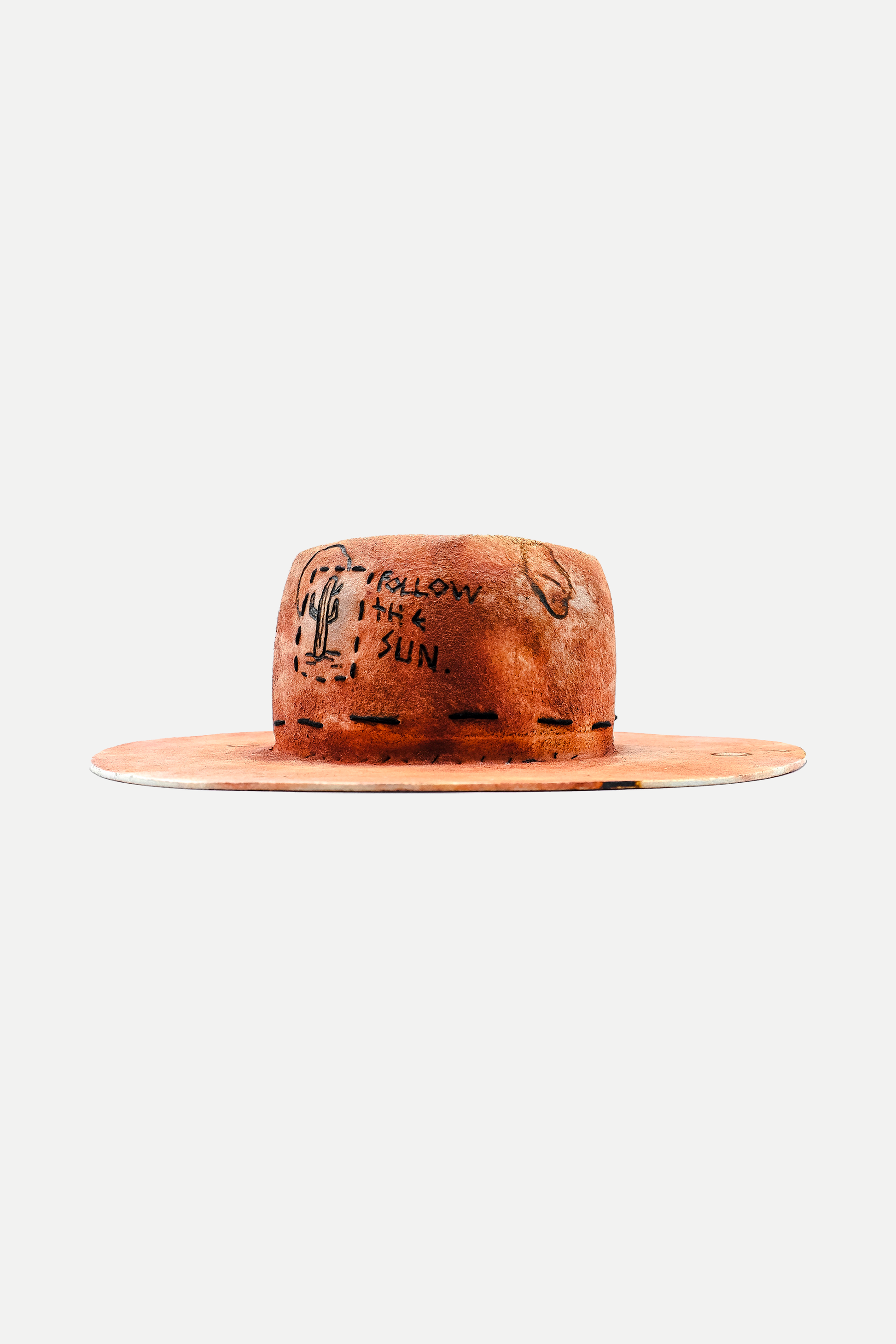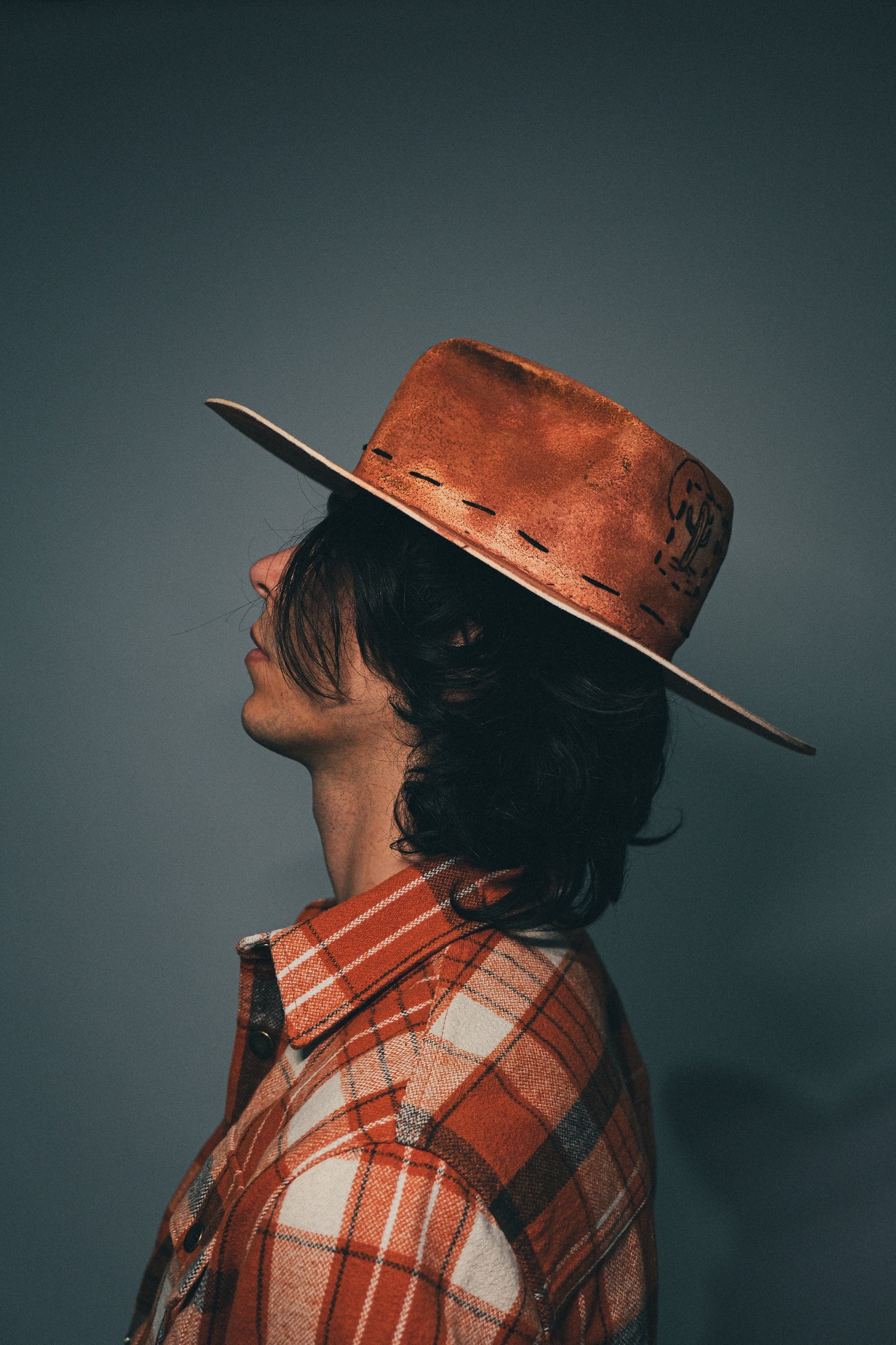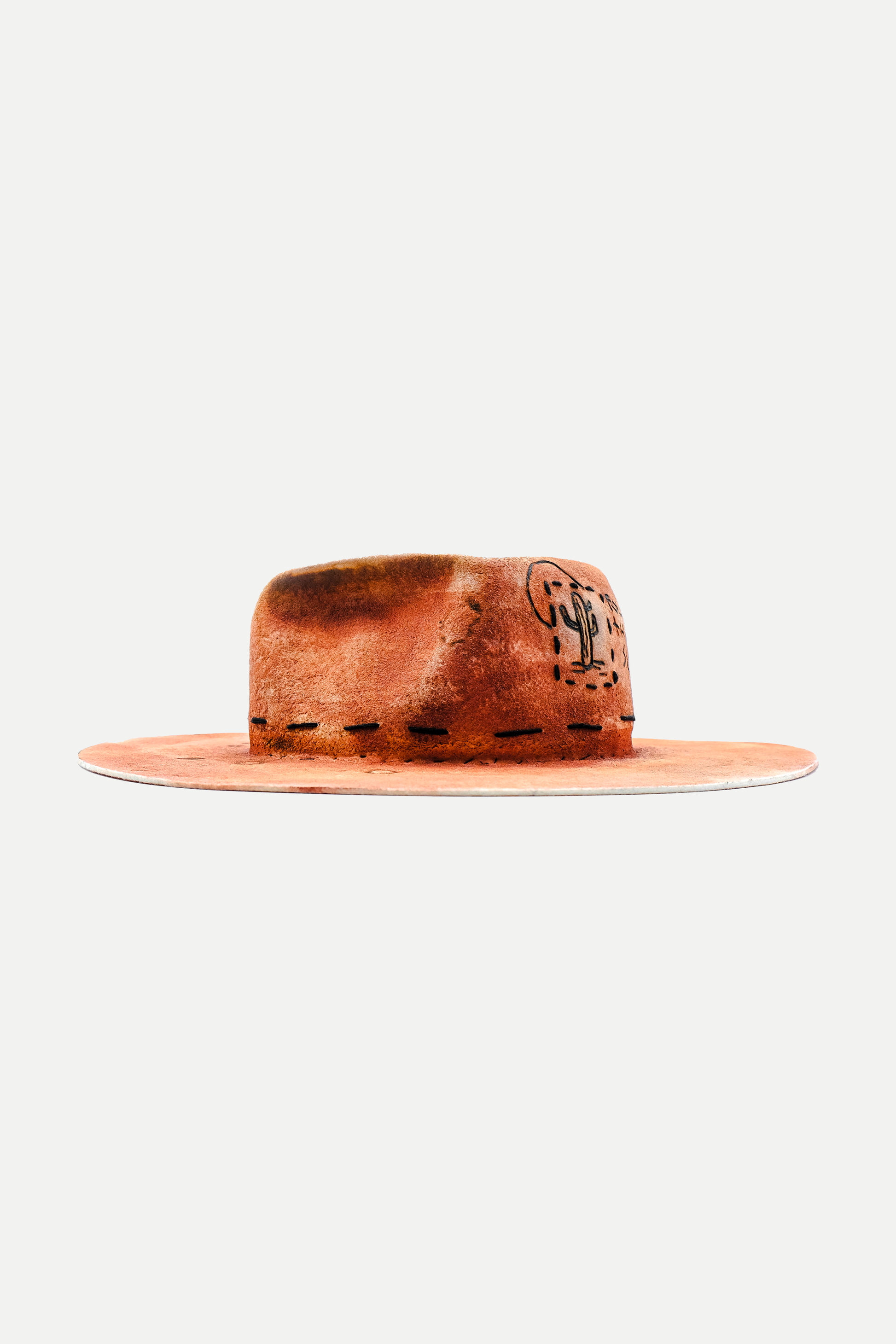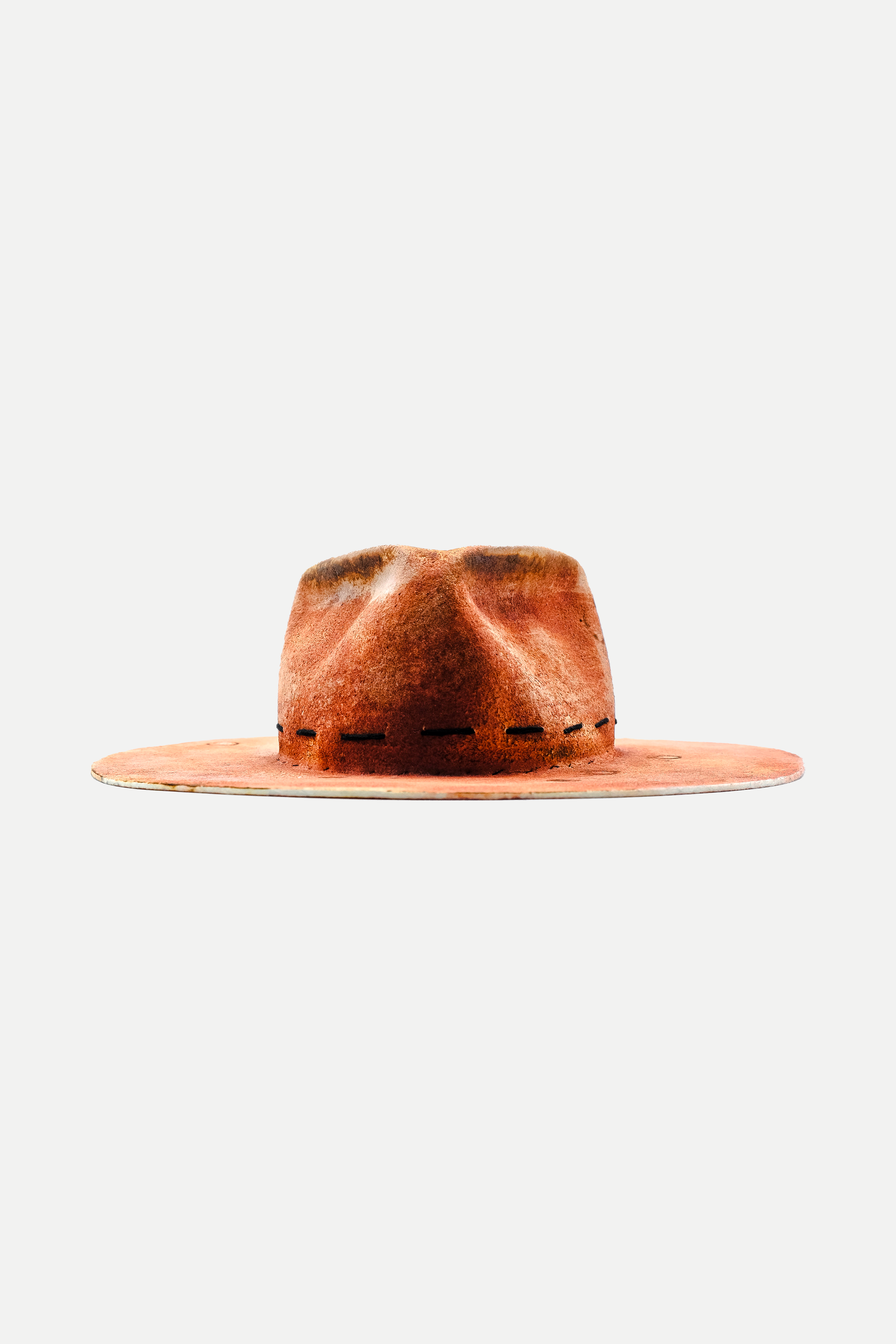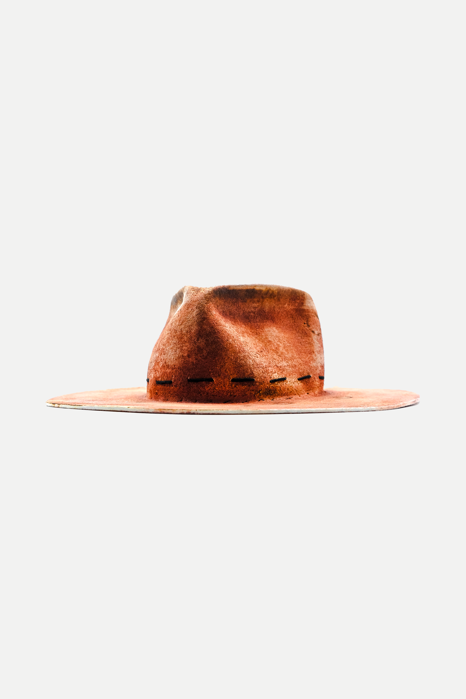 Ispirato all'omonimo stivale POCHLY, il Tangerine Tango è un cappello realizzato completamente a mano in puro feltro di coniglio Premium, con texture grunge, imbastiture interrotte lungo tutta la corona che sostituiscono la fascia e arricchito di incisioni fatte a mano.
