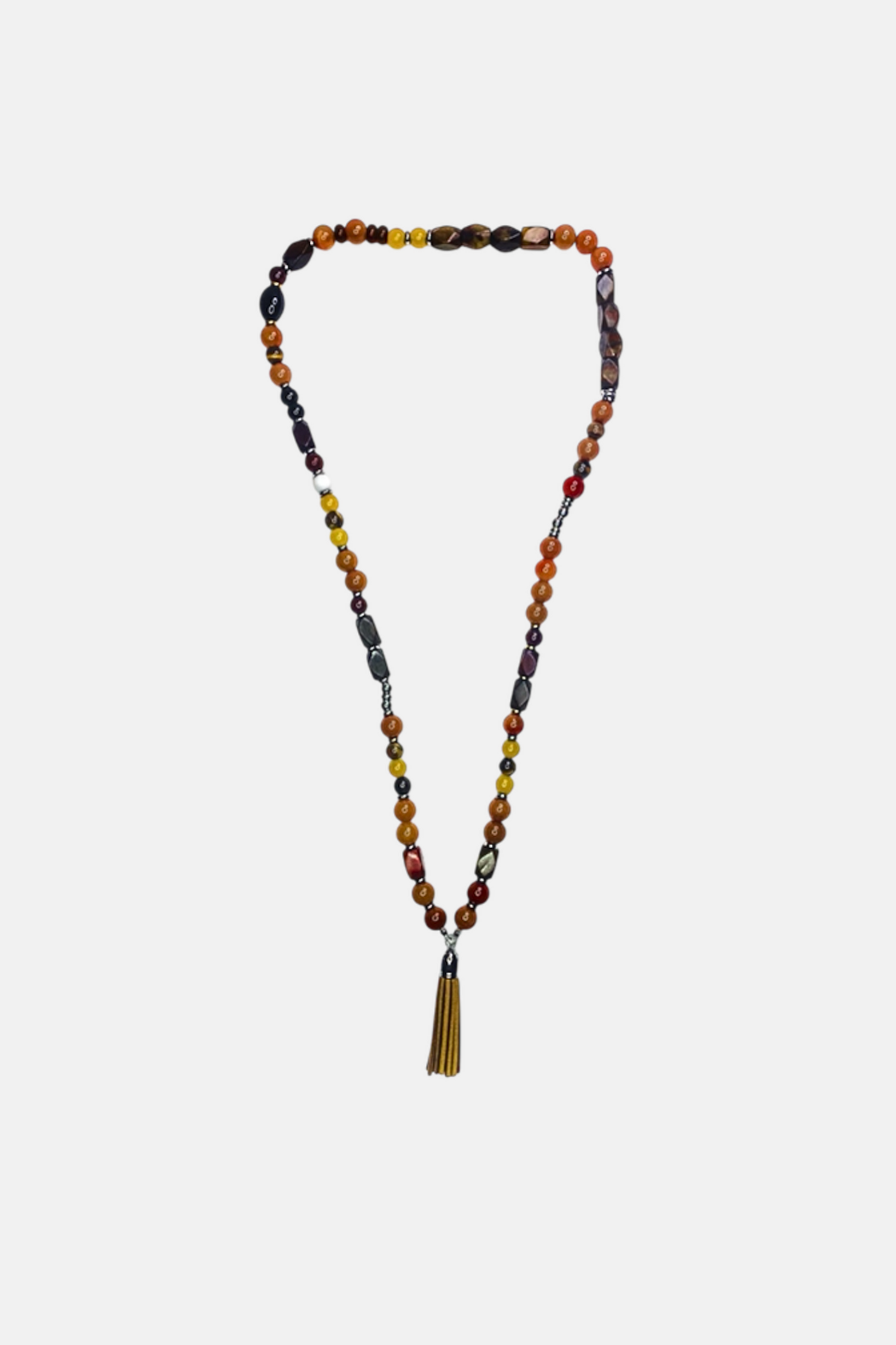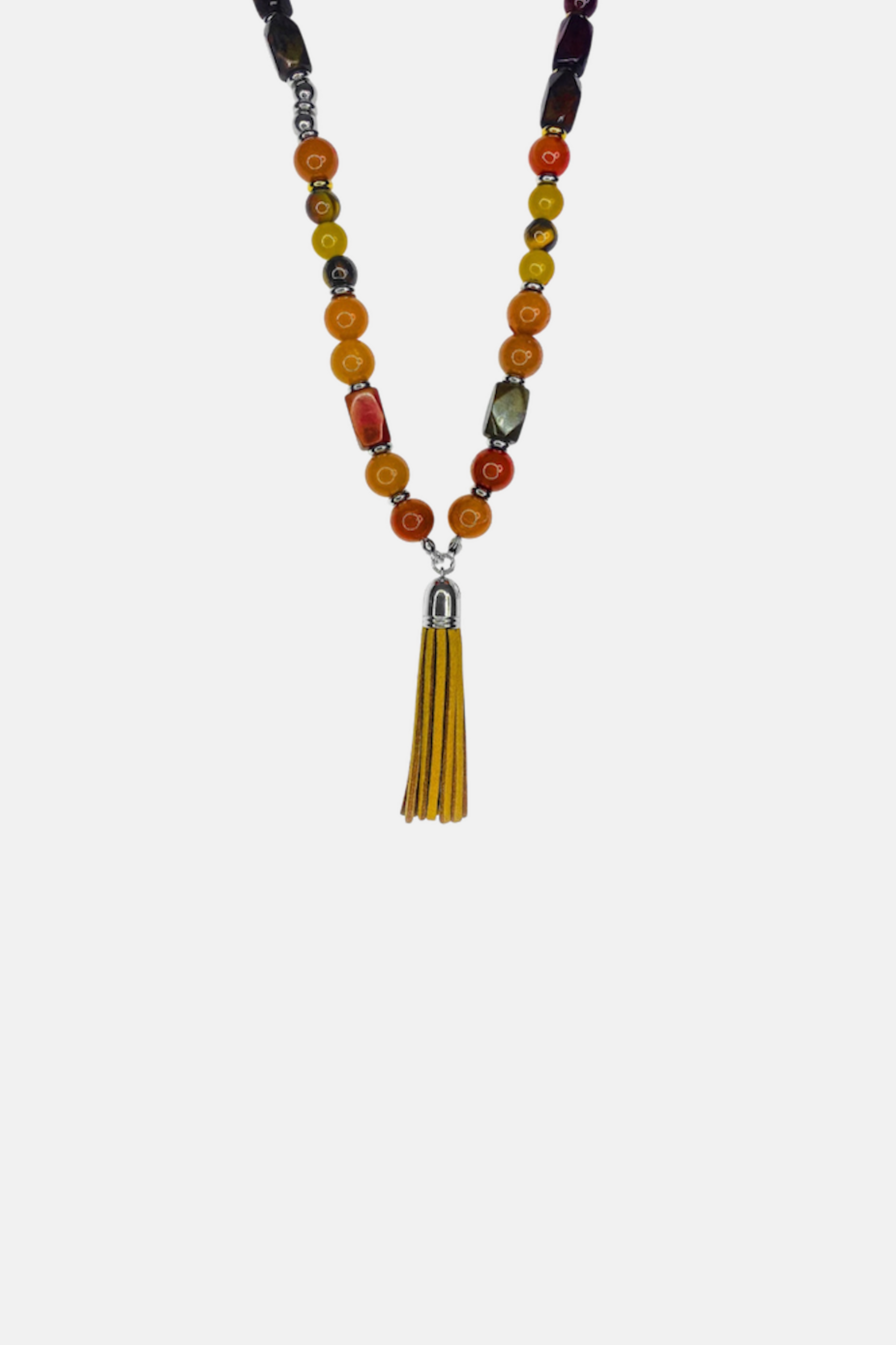 Dalla nuova collezione "SETTIMA ARTE" arriva una collana dai meravigliosi colori ispirata all'intramontabile capolavoro western di Sergio Leone, "Il Buono, il Brutto, il Cattivo". Realizzata a mano in stile Mala Tibetano con pietre di Agata Arancione, Agata Gialla, Agata Rossa, Agata Bianca, Ambra rettangolare, Occhio di Tigre, Onice Nero tondo e ovale, rondelle di Agata Marrone, intermezzi in Acciaio 316L e nappina marrone chiaro in camoscio.
